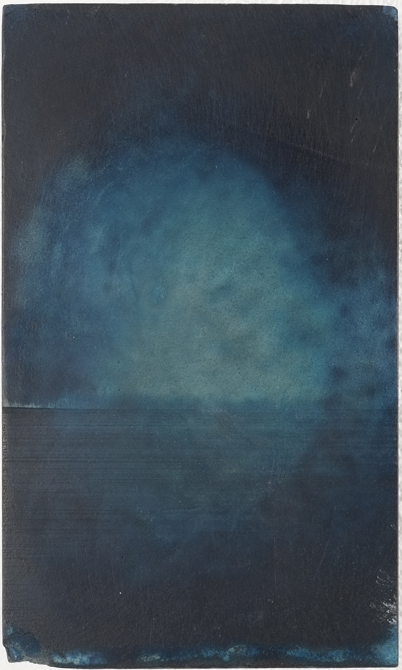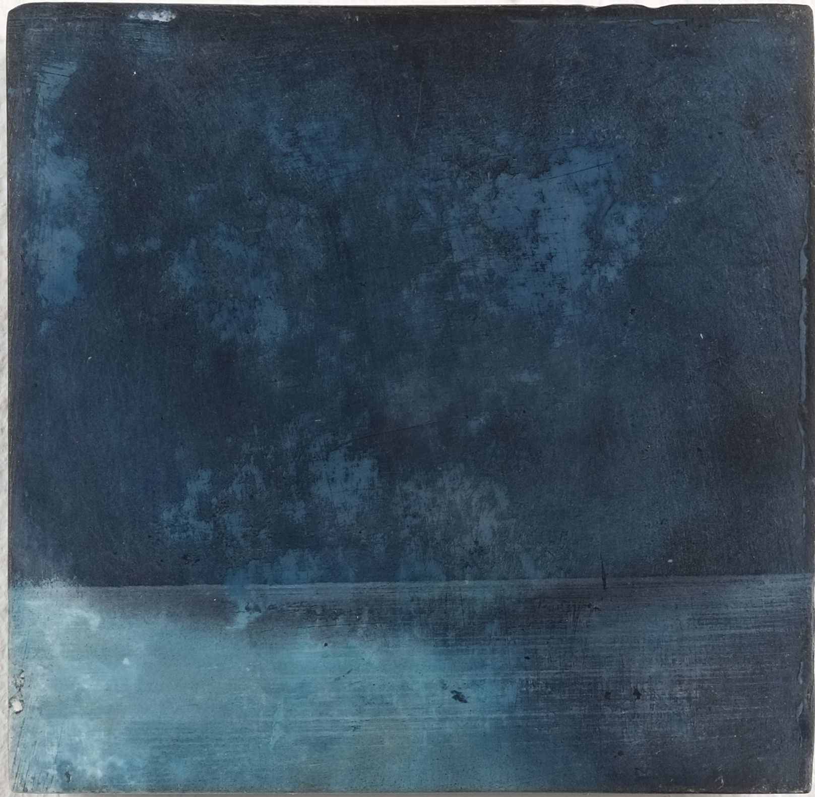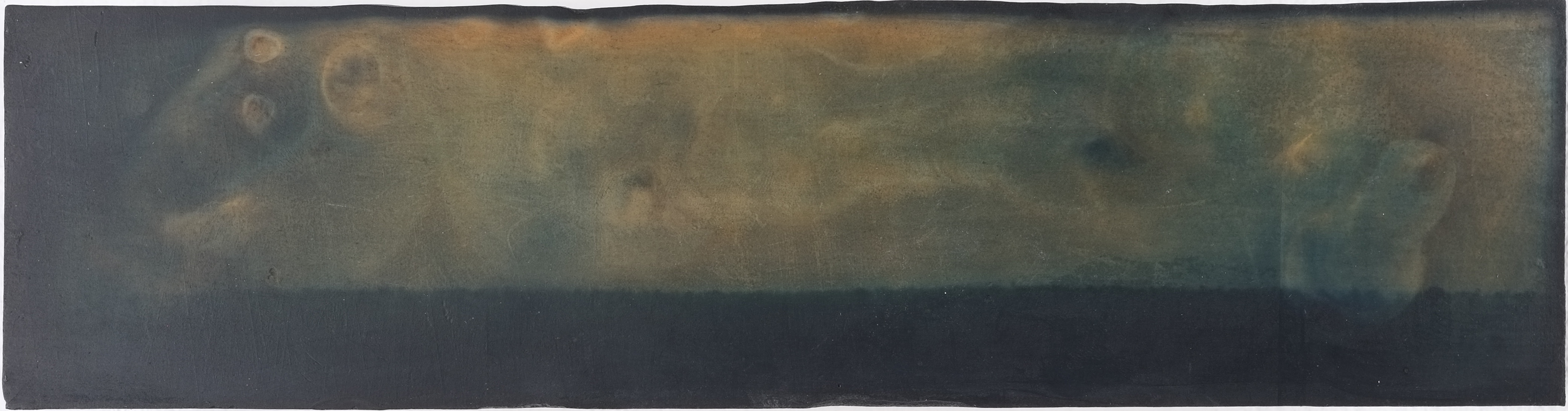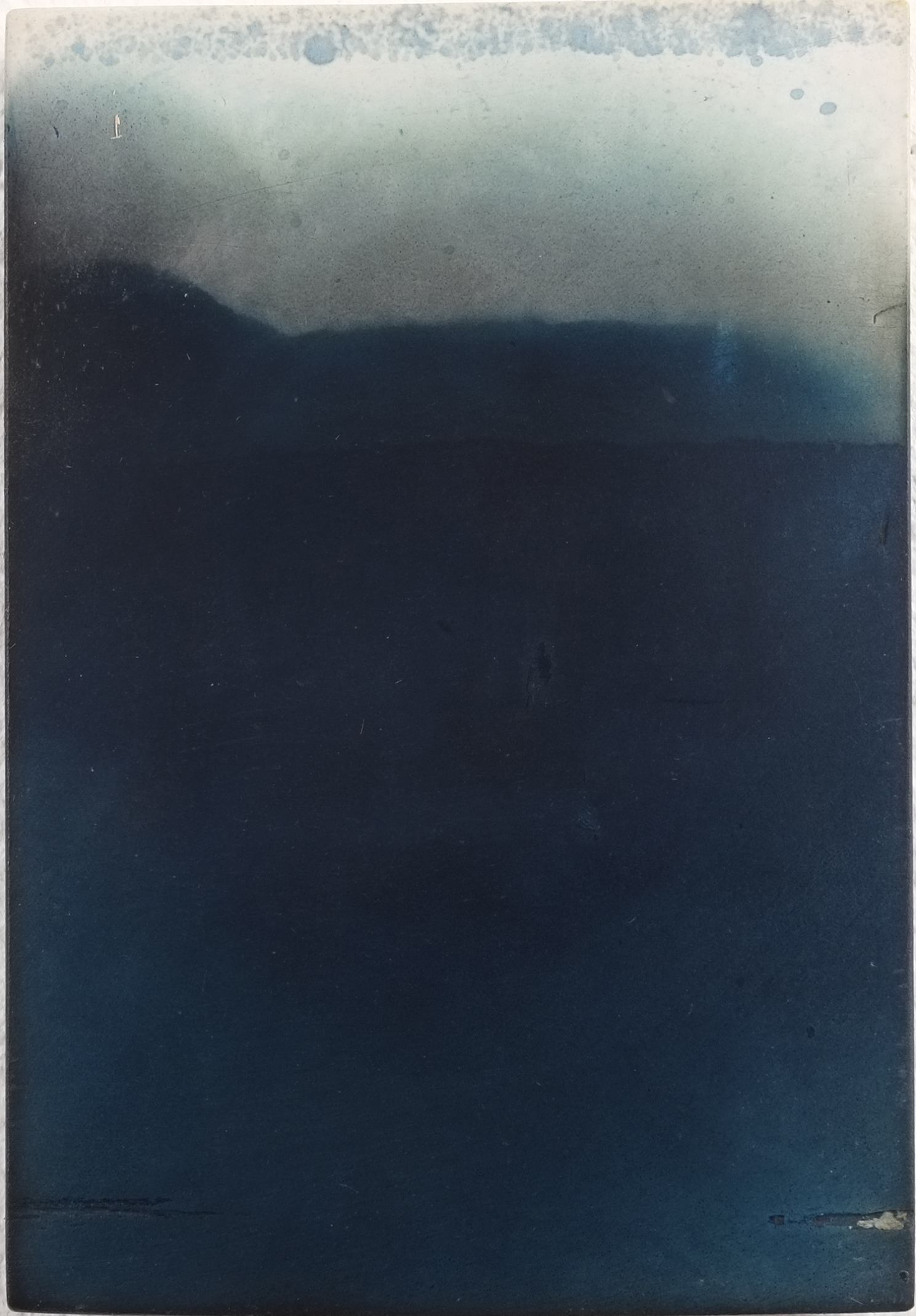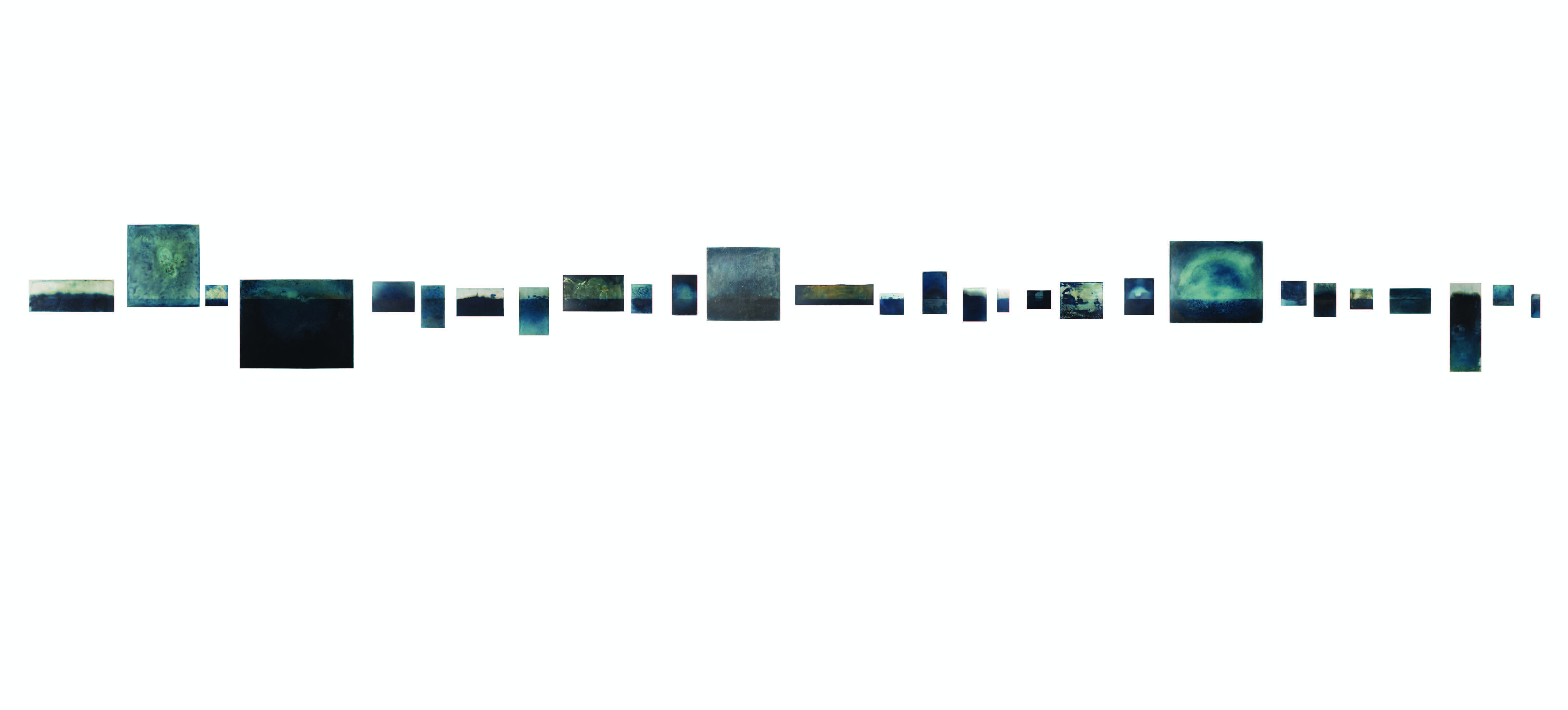 Les cyanotypes (traces de lumières sur un support de plâtre) sont accrochés sur une ligne d’horizon. Ils peuvent être renversés – individuellement ou dans leur ensemble – de 180 degrés pour questionner le rapport à cette ligne de perception. Un renversement déstabilisant de valeurs, de réalités, de positionnement face au monde environnant.