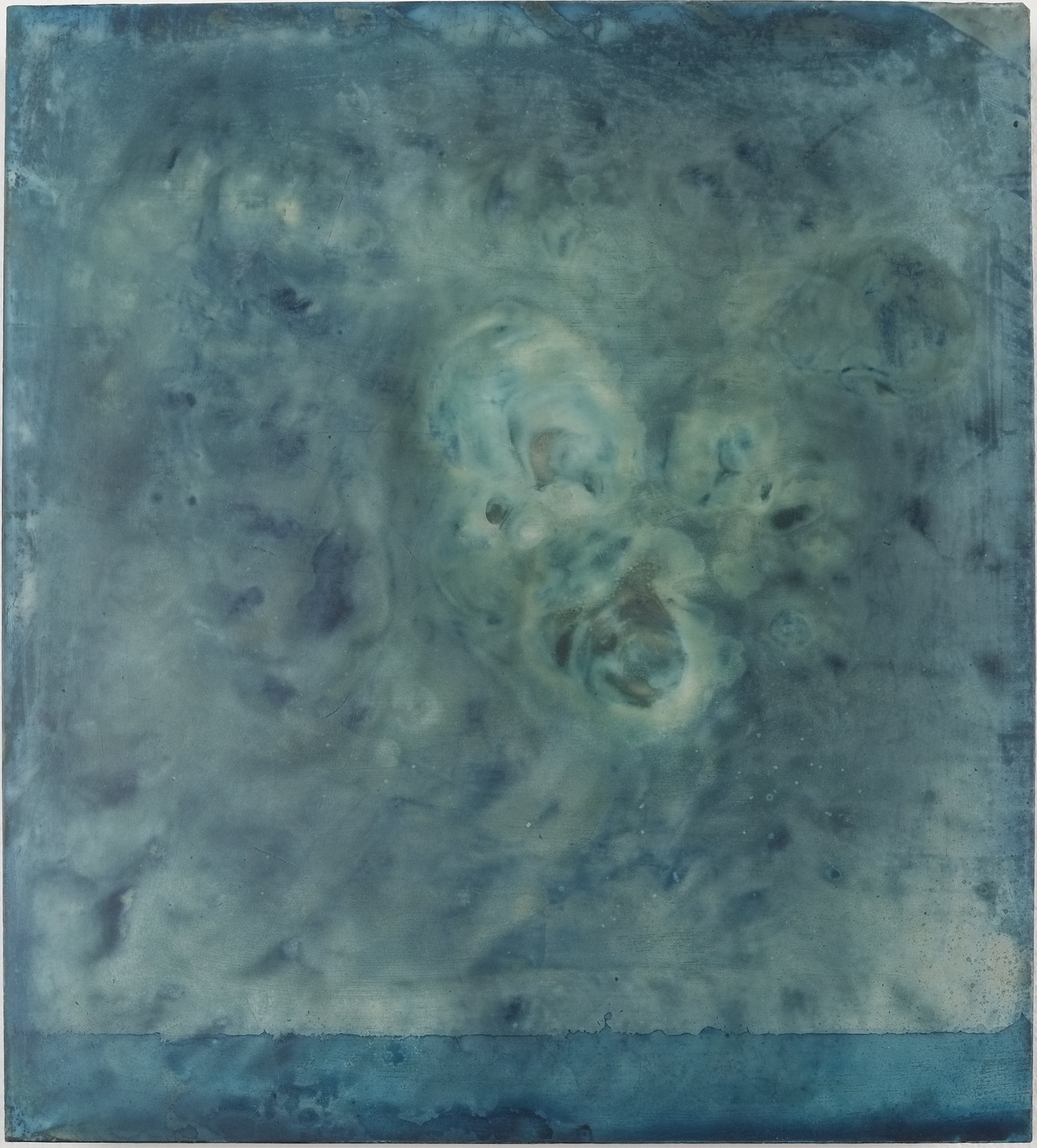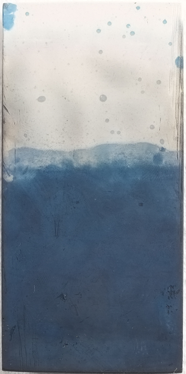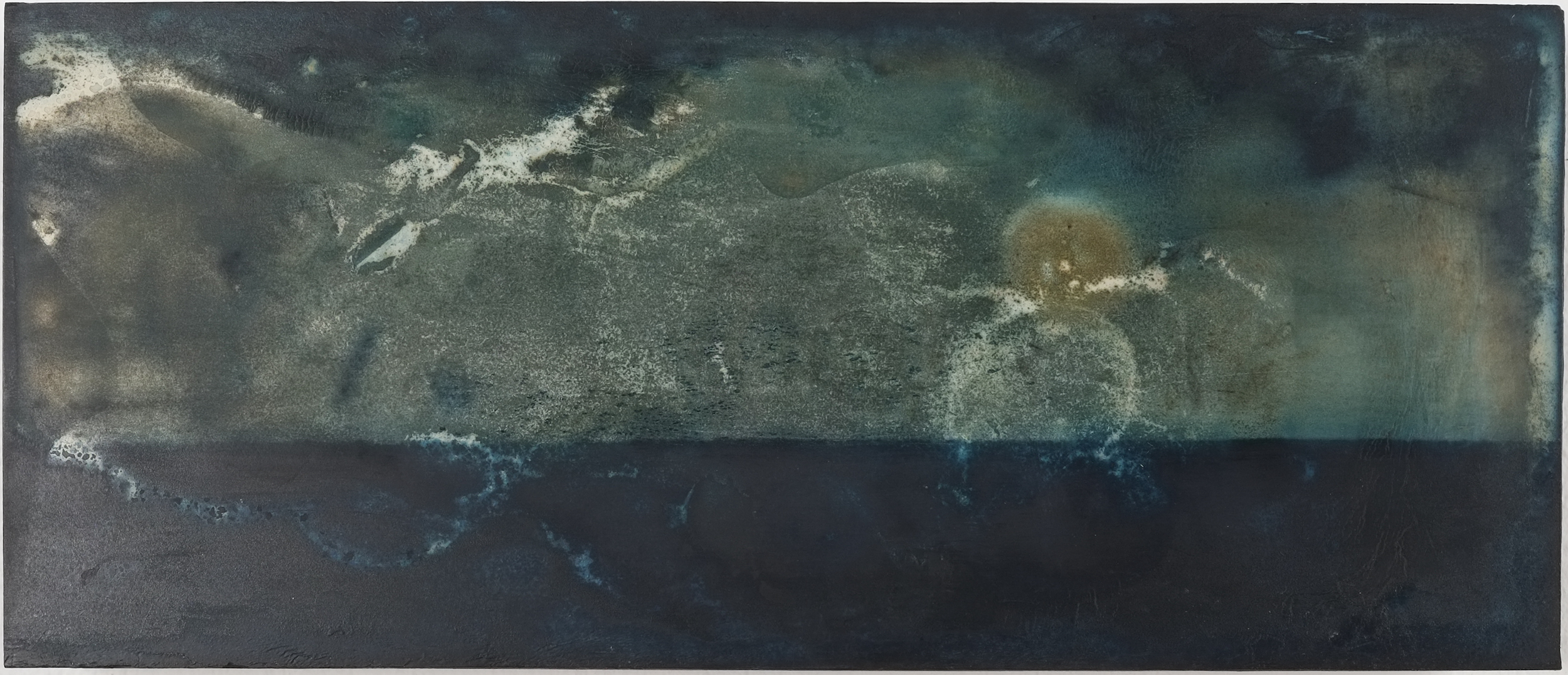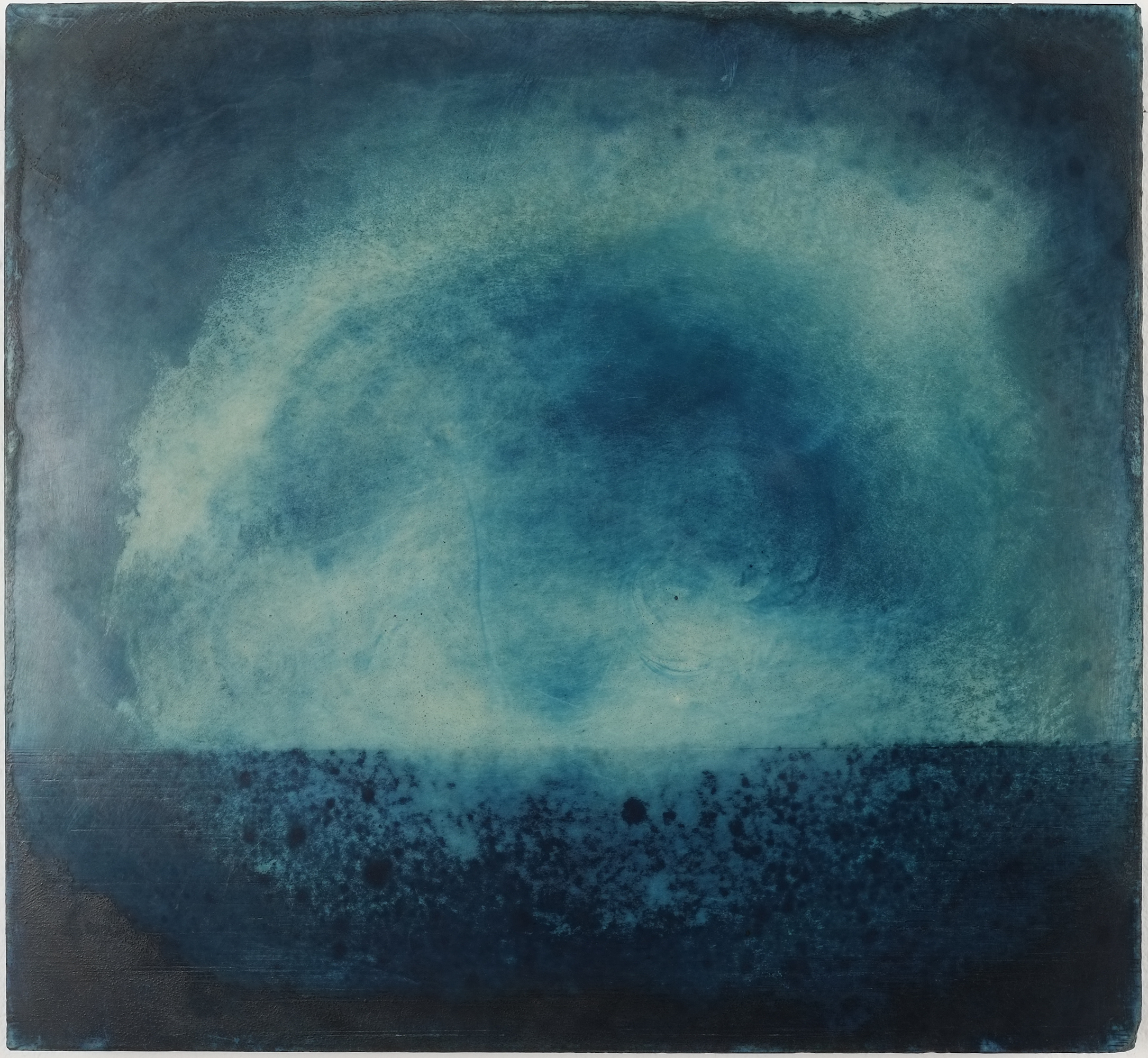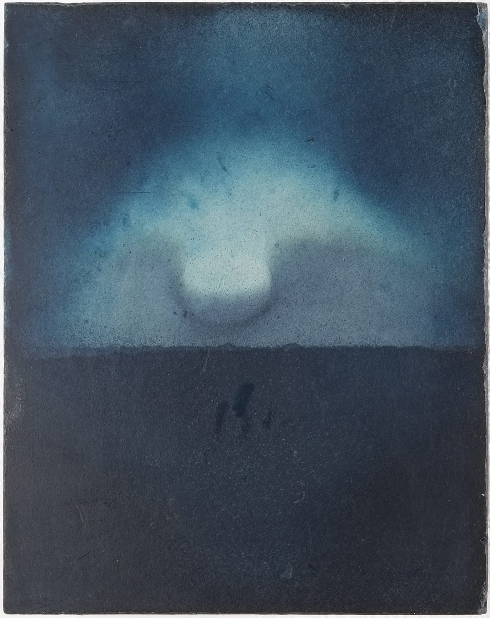 Les cyanotypes (traces de lumières sur un support de plâtre) sont accrochés sur une ligne d’horizon. Ils peuvent être renversés – individuellement ou dans leur ensemble – de 180 degrés pour questionner le rapport à cette ligne de perception. Un renversement déstabilisant de valeurs, de réalités, de positionnement face au monde environnant.