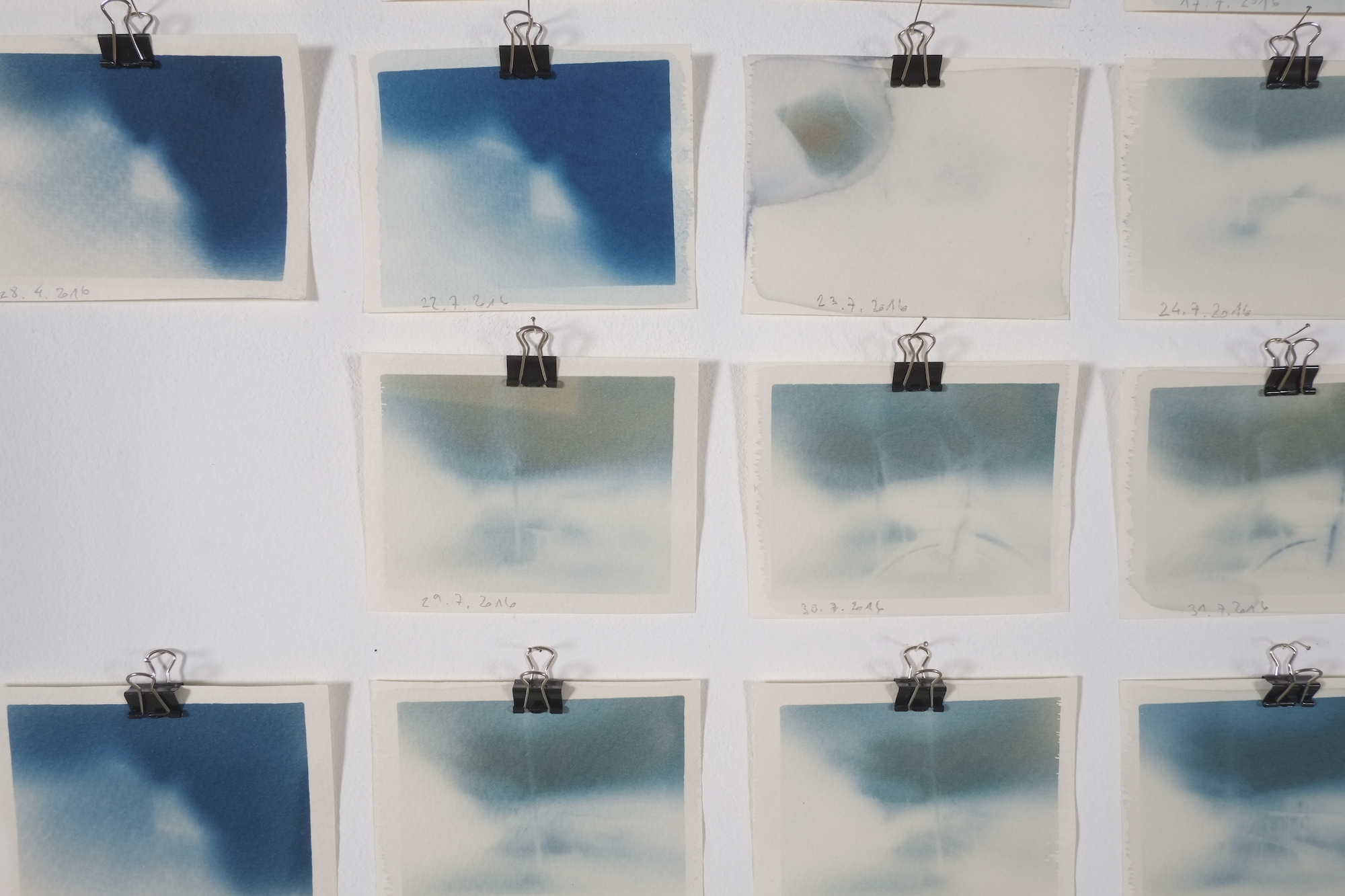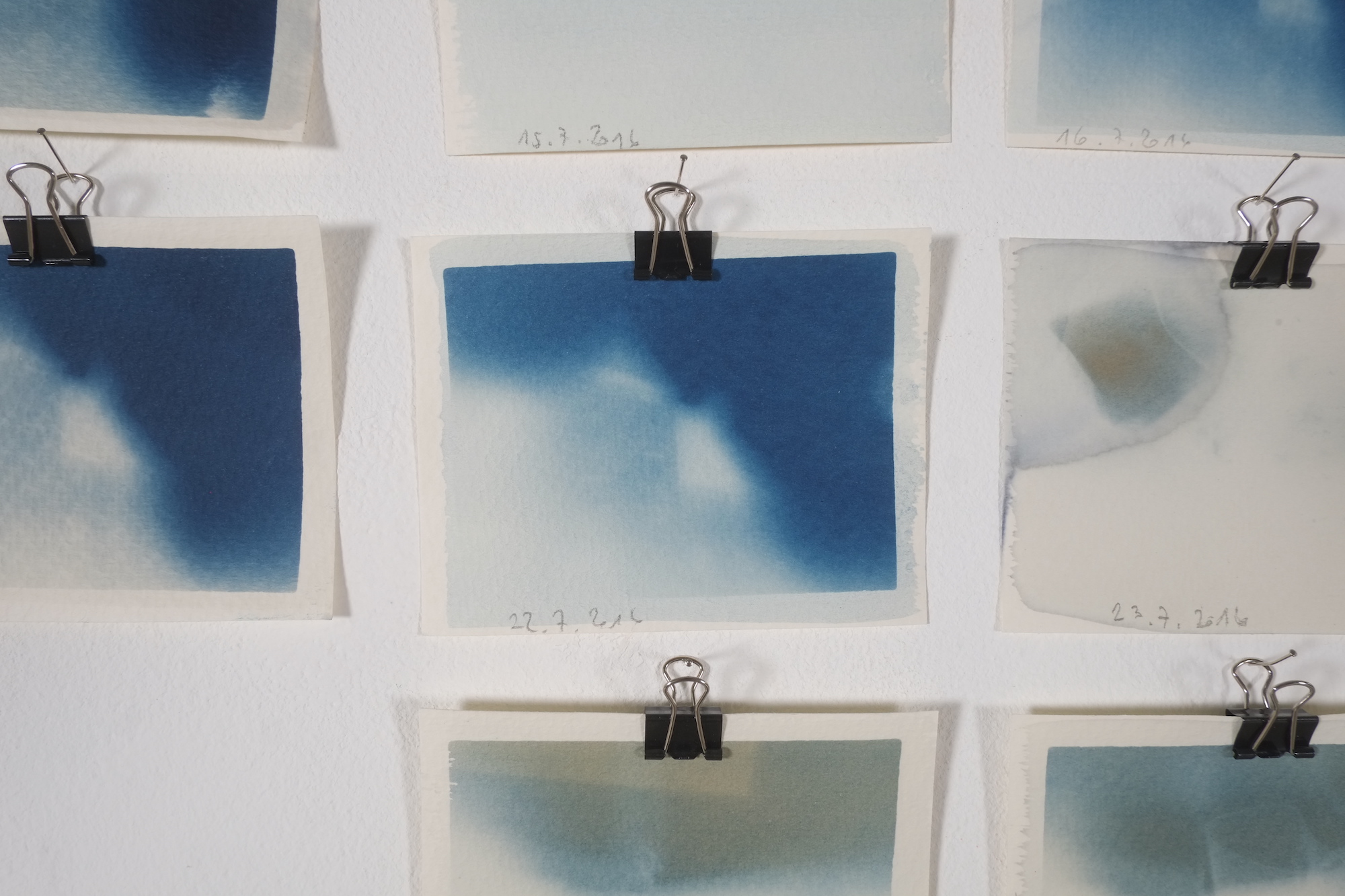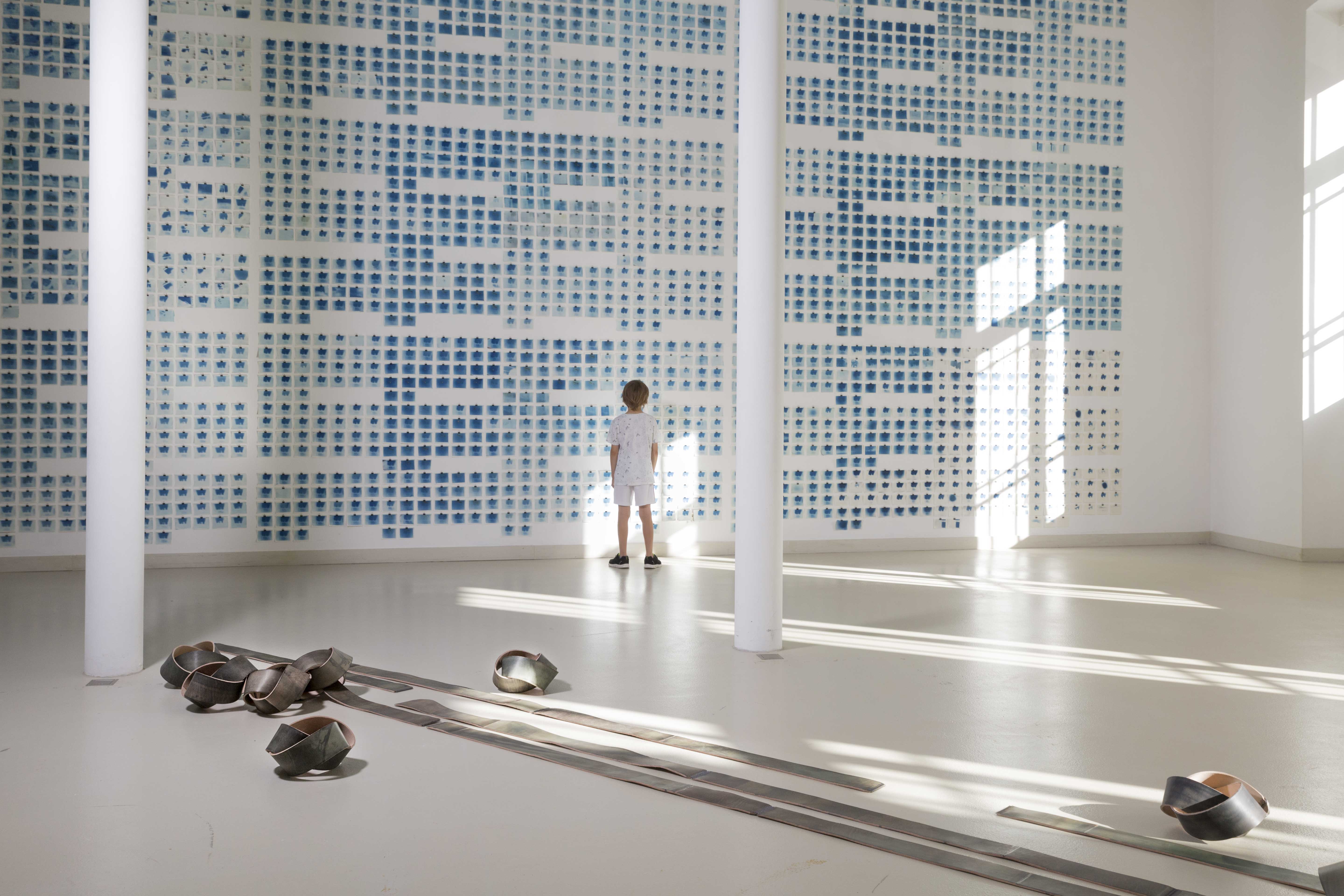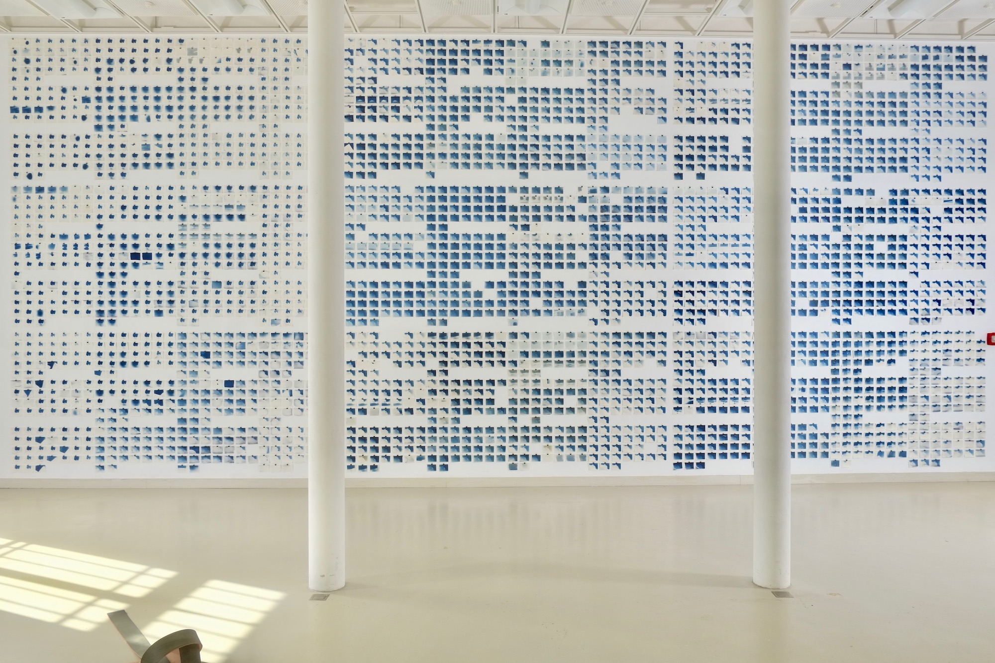 Jours 2002 à 2019 : un cyanotype par jour (18 années) sur papier Dorée 225 g/m2, dimensions : ensemble de deux parois de chacune 445 cm (h) x 988 cm (l) (images de 8 x 10.2 cm),