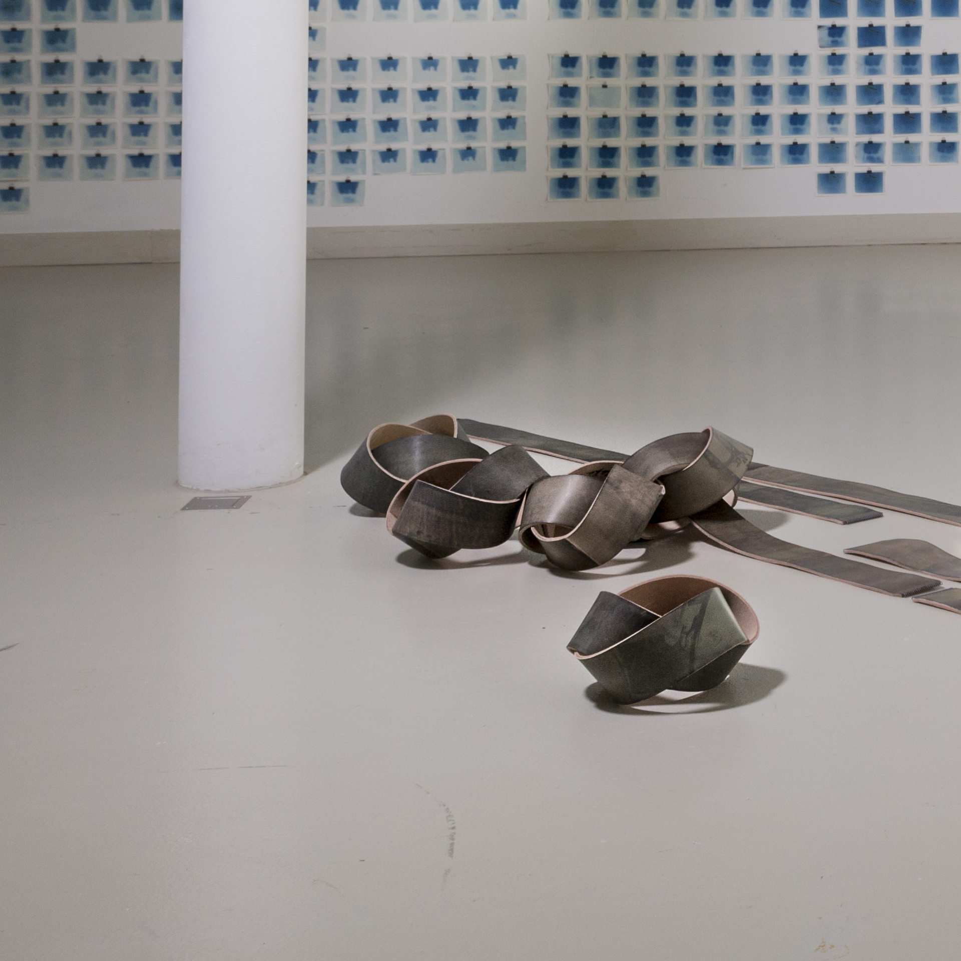 En écho à ces questions existentielles, l’installation Passer VII occupe très exactement les deux parois principales. Concrètement, cela signifie que toutes les cartes de cyanotype réalisées depuis le début de mon projet, le 1er janvier 2002 jusqu’au 31 décembre 2019 sont exposées. Mais, les photographies de l’année entamée (2020) restent confinées dans une boîte, dans la vitrine de la galerie, à l’extérieur de l’espace.