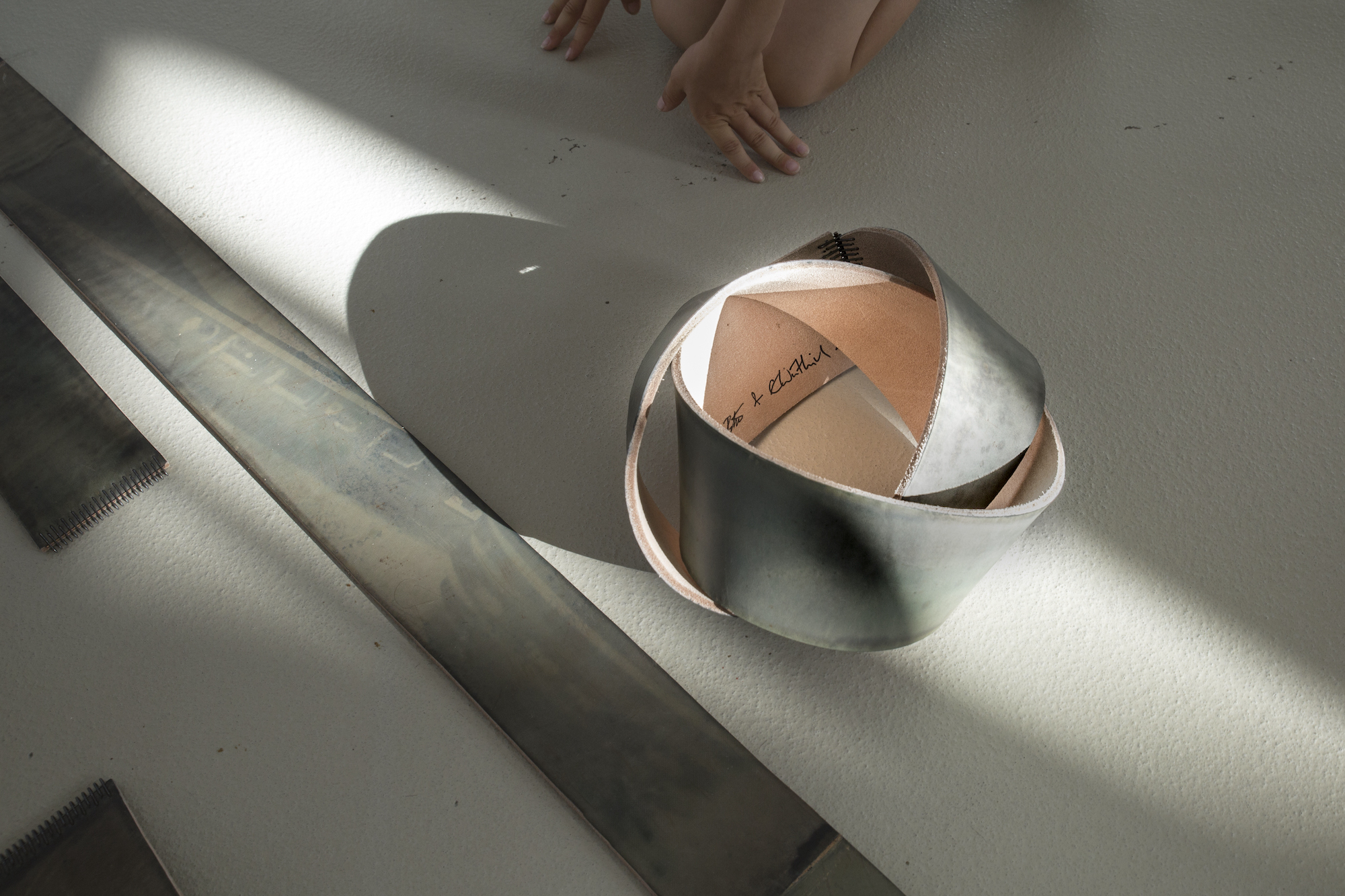 NO[eu]D est un clin d’oeil immobile à l’état du monde en période de pandémie. Les courroies de cuir prennent place dans l’espace d’art contemporain (Les Halles) déroulées ou nouées sur elles-mêmes ou à d’autres bandes. Elles se réfèrent également au nœud gordien.