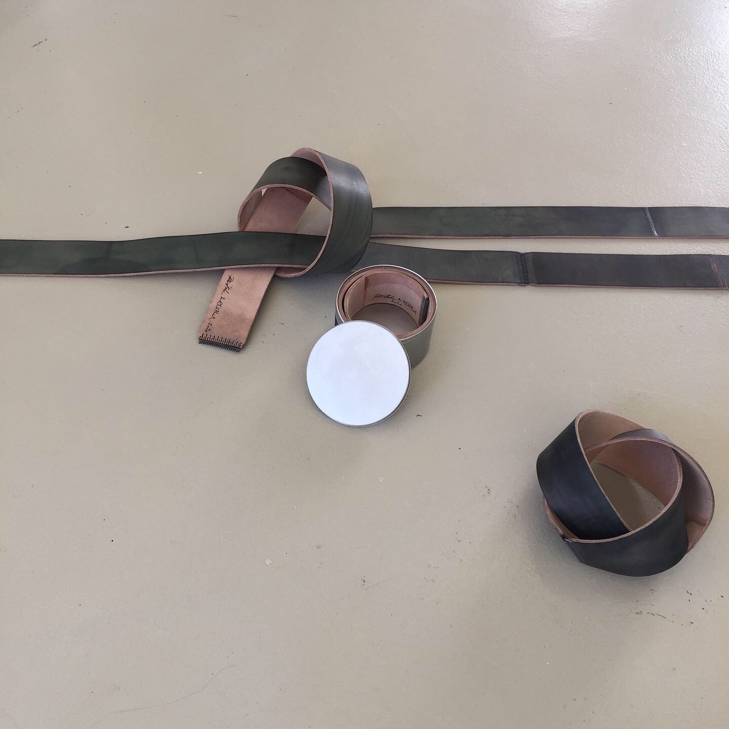 NO[eu]D : Cyanotypes sur cuir, 16 courroies de transmission en cuir dans leur boîte métallique ø 18 cm (hauteur 10cm)