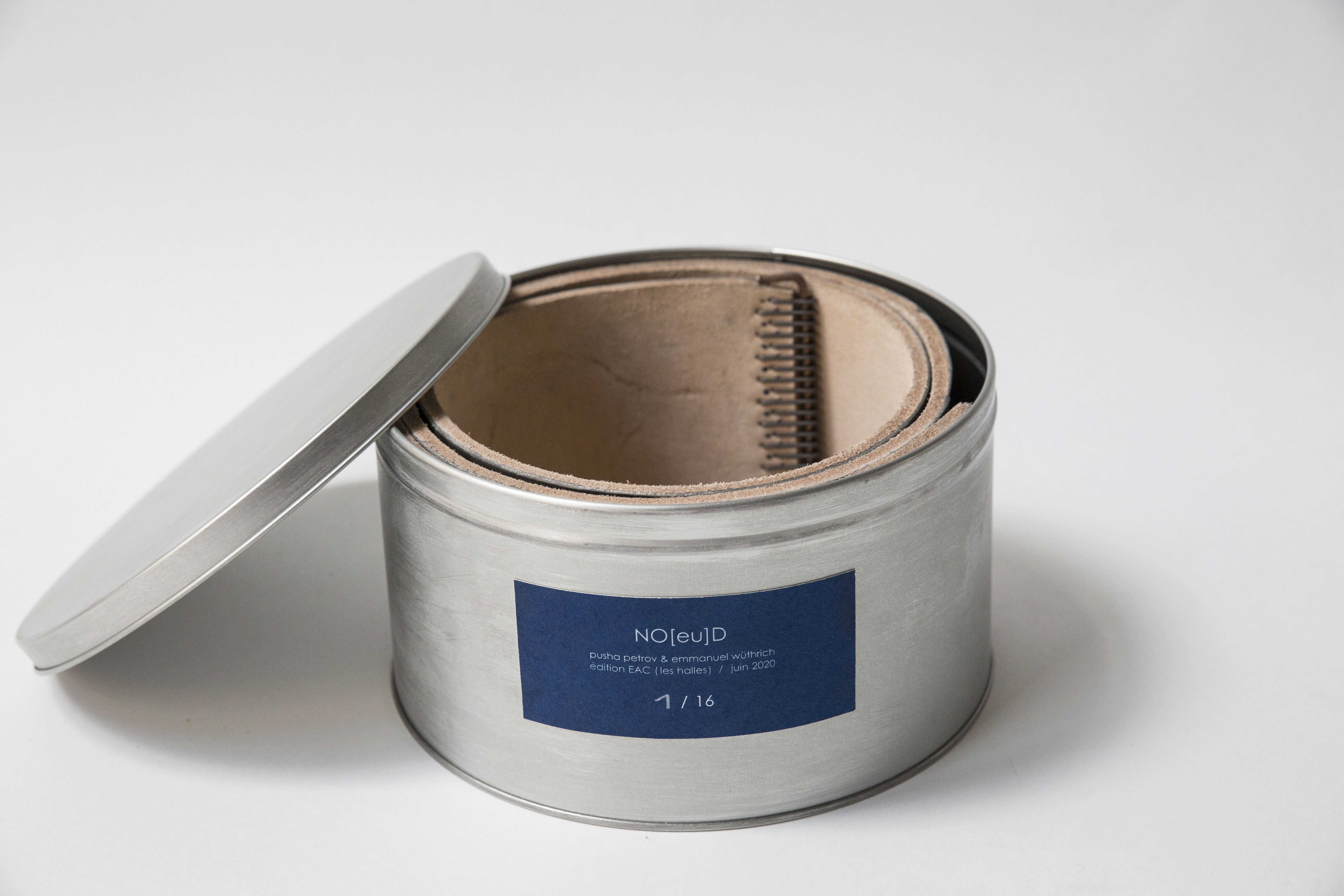 L’installation NO[eu]D* est constituée des éditions de cyanotypes sur courroies de cuir (1/16 à 16/16) et présentée dans l’espace de la galerie. L’Edition a été réalisée avec Pusha Petrov, artiste roumaine en résidence à Porrentruy pour ce projet.