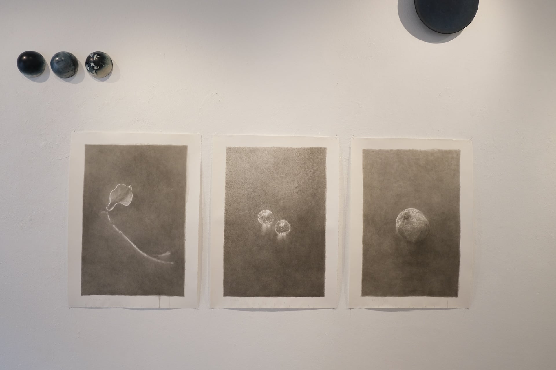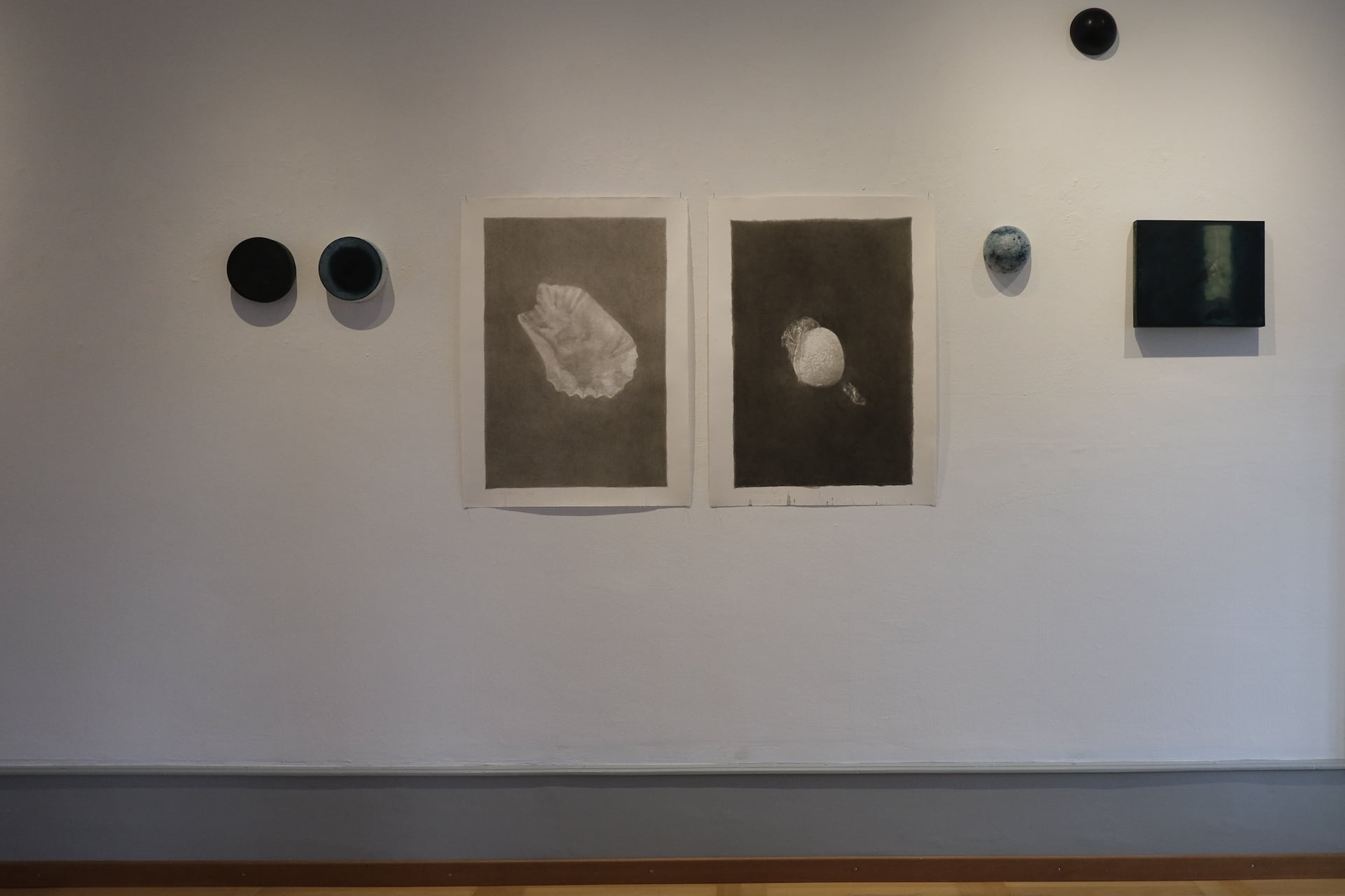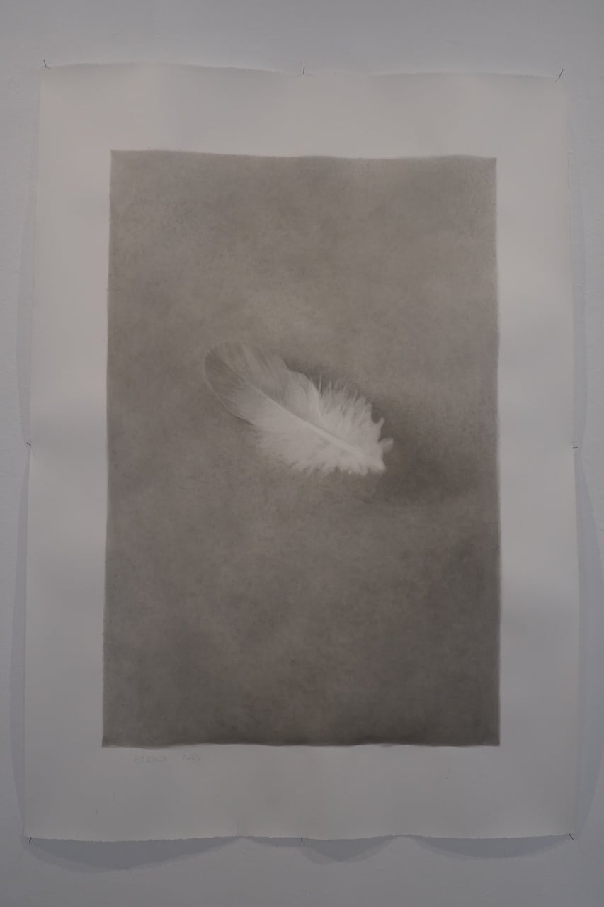 Le lavis dit Plume (2023), une des œuvres maîtresses de l’exposition, suggère qu’une simple brise pourrait la faire décoller ; qu’elle pourrait faire pencher à elle seule le plateau de la balance de la justice des dieux égyptiens ; qu’elle possède encore en elle une puissance aérienne libérée des pesanteurs de ce monde. Une plume perdue par le Rouge-gorge mort (2023) à voir au fond de la salle. Une plume qui incarne elle aussi le rêve de voyage, de délivrance, d’envol vers de nouveaux horizons. Même si l’oiseau sait que l’horizon n’existe pas.