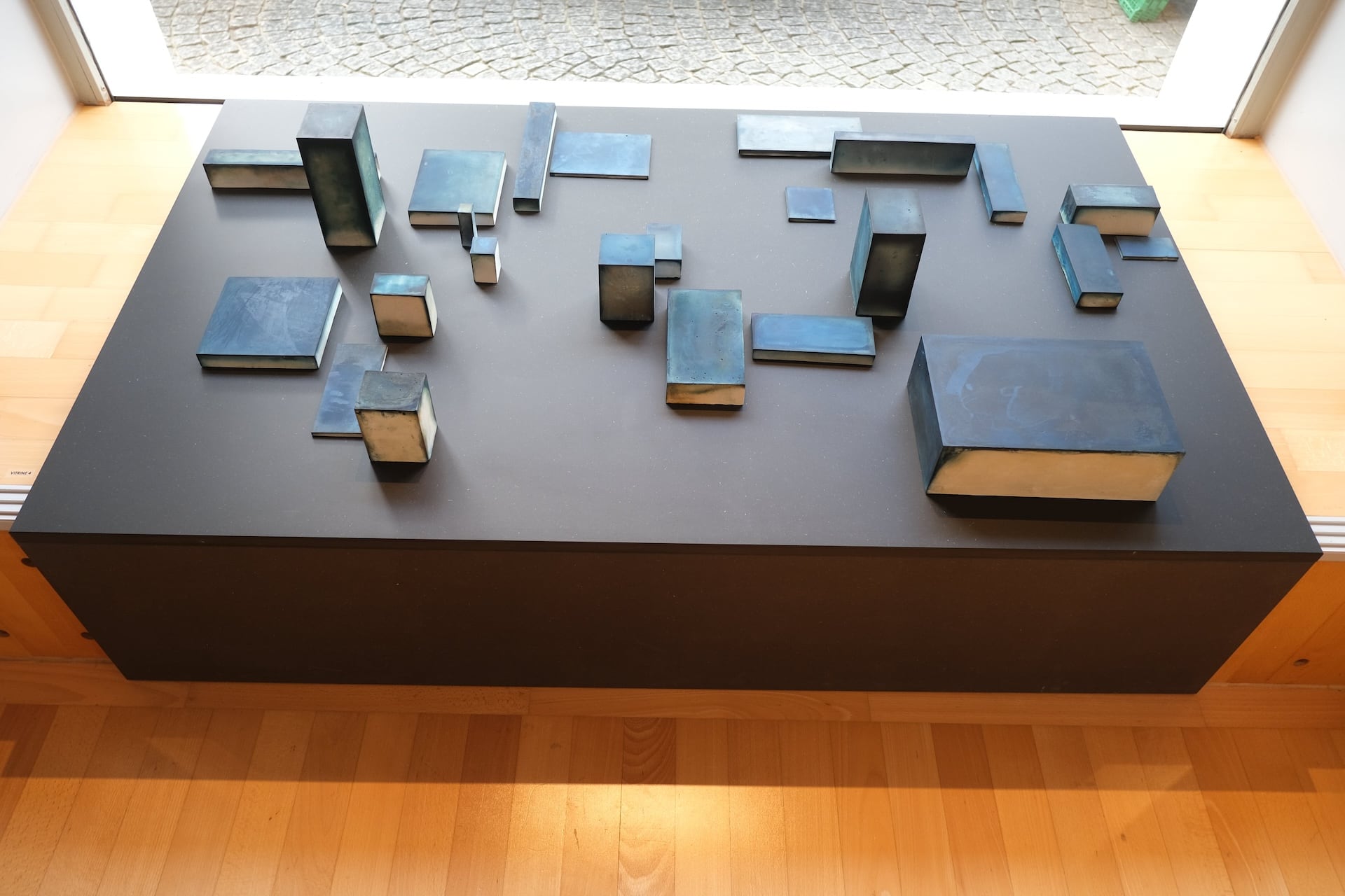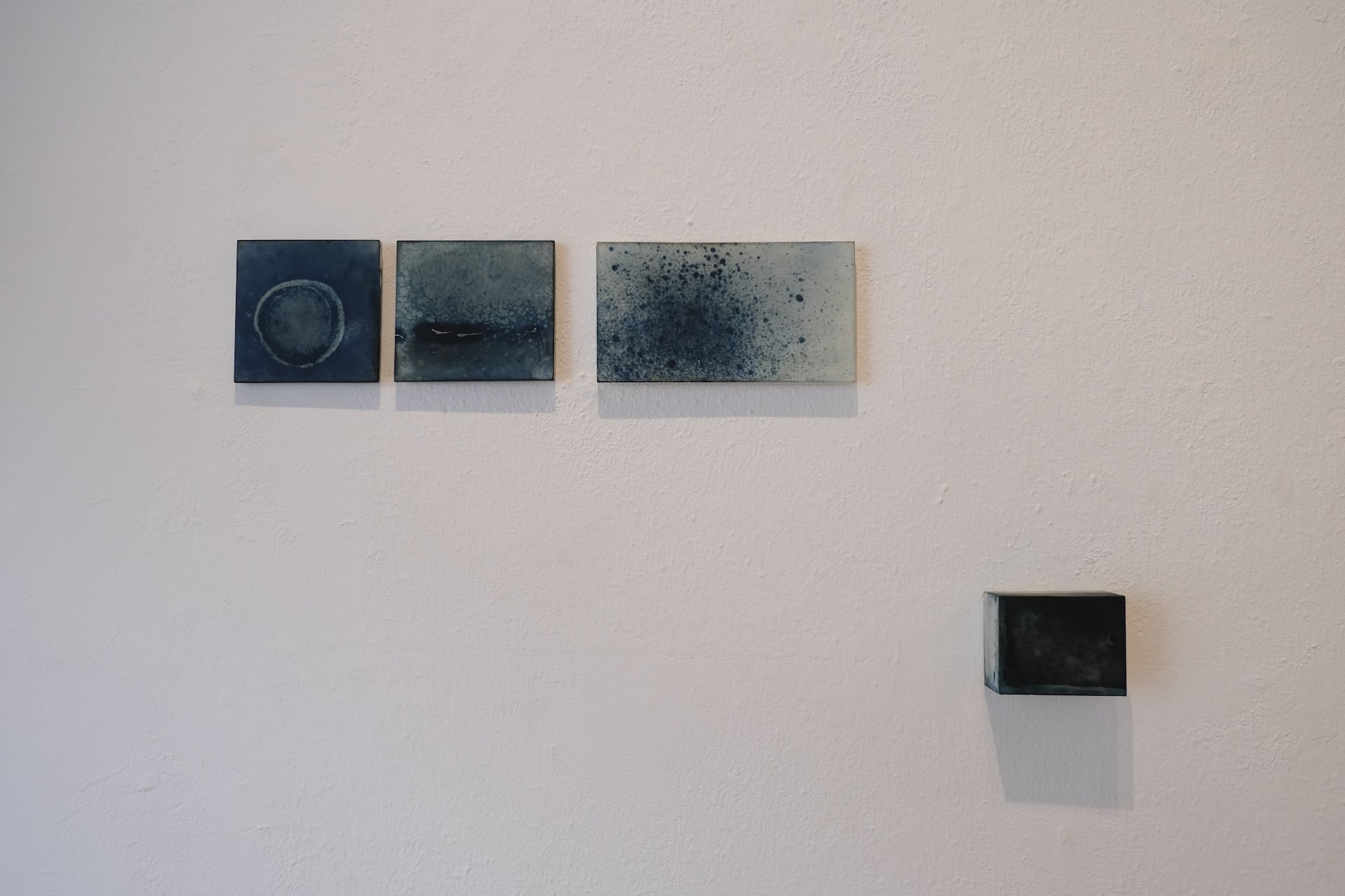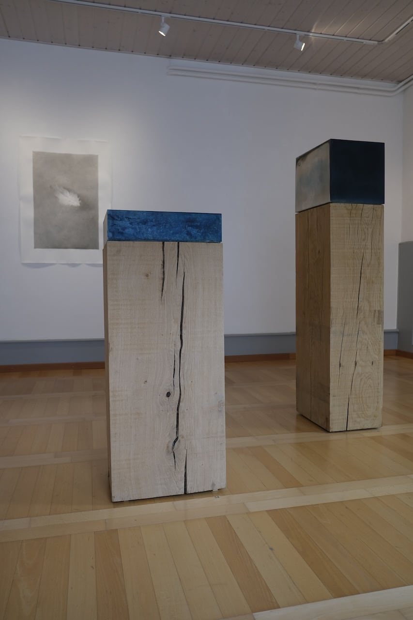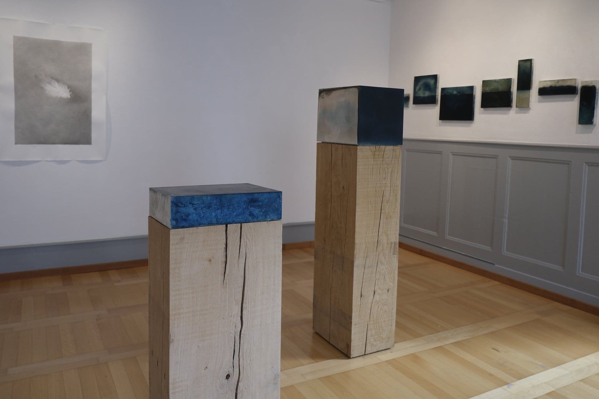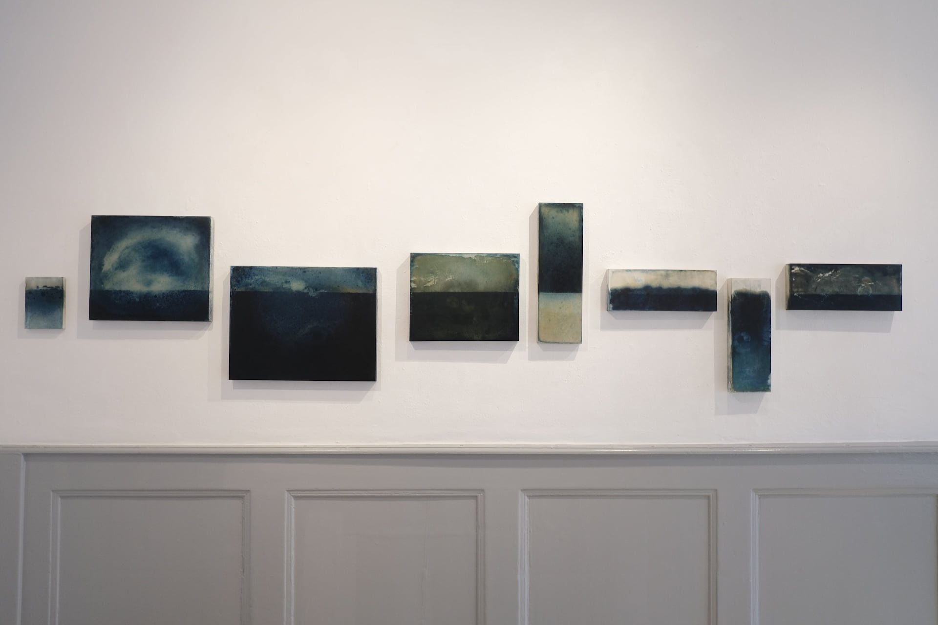 Il y a aussi le passage d’une rive à l’autre. C’est le sujet des cyanotypes sur plâtre. En fonction de la porosité de la brique de plâtre, de la stabilité de sa composition chimique, le mélange photosensible va réagir différemment au contact de l’ensoleille¬ment. Ainsi, un grand éventail de bleus de Prusse, de bleu profond, de bleu clair, de bleu sale, de bleu-vert évoquent-ils la mer ou le ciel, parfois séparés par un horizon. L’interprétation du résultat s’avère plus complexe qu’il n’y paraît. D’abord, la démarche s’inscrit dans une tradition moderne initiée par Rimbaud quand il dénonce la peinture académique – « Quel siècle à mains ! », ensuite par Marcel Duchamp pour qui le métier, le don, la facture ou « la patte » n’ont plus lieu d’être et dont les ready-made transforment l’objet en acte. Outre la très grande place laissée au hasard, les cyanotypes sur plâtre s’avèrent aussi des invitations à la méditation. Ils forment également un trait d’union avec le travail de l’artiste sur les migrants et leur rêve d’un ailleurs. Enfin, le symbole du bleu s’impose. Le bleu azur de la Méditerranée, le bleu noir presque opaque de la Mer du Nord, mais aussi les bleus discrets pris dans la vase d’un étang.
