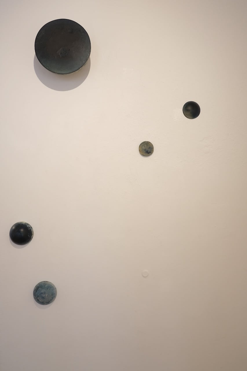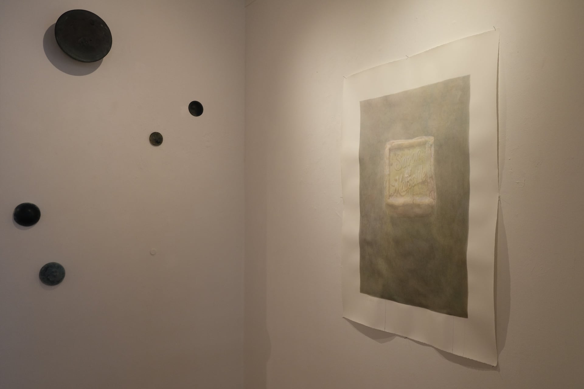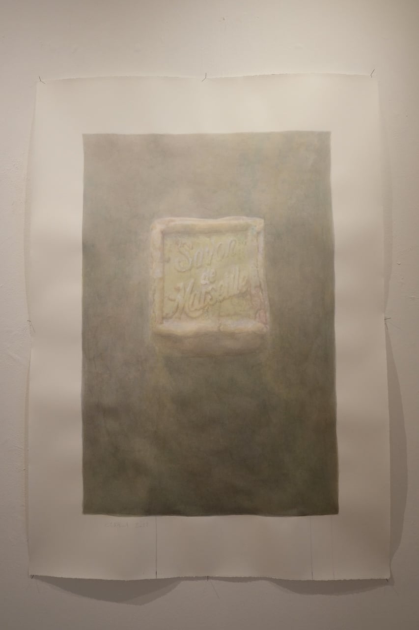 Enfin, il y a le passage de la main. Certains lavis, comme la plume ou le Savon de Marseille (2023) ont demandé 30 à 40 passages du pinceau. La technique du lavis est chronophage. Il s’agit de superposer des couches très diluées dont chacune nécessite un temps de séchage. Ce qui ressemble à une aquarelle rapidement esquissée exige en réalité un travail de bénédictin, qui vient en quelque sorte contredire ou contrebalancer, comme on voudra, l’absence de savoir-faire malicieusement suggérée par les œuvres sur plâtre.