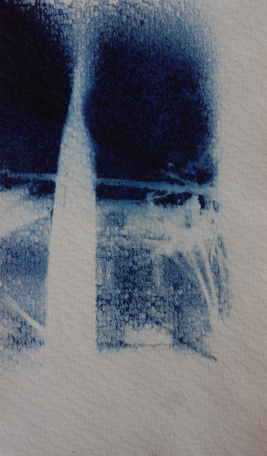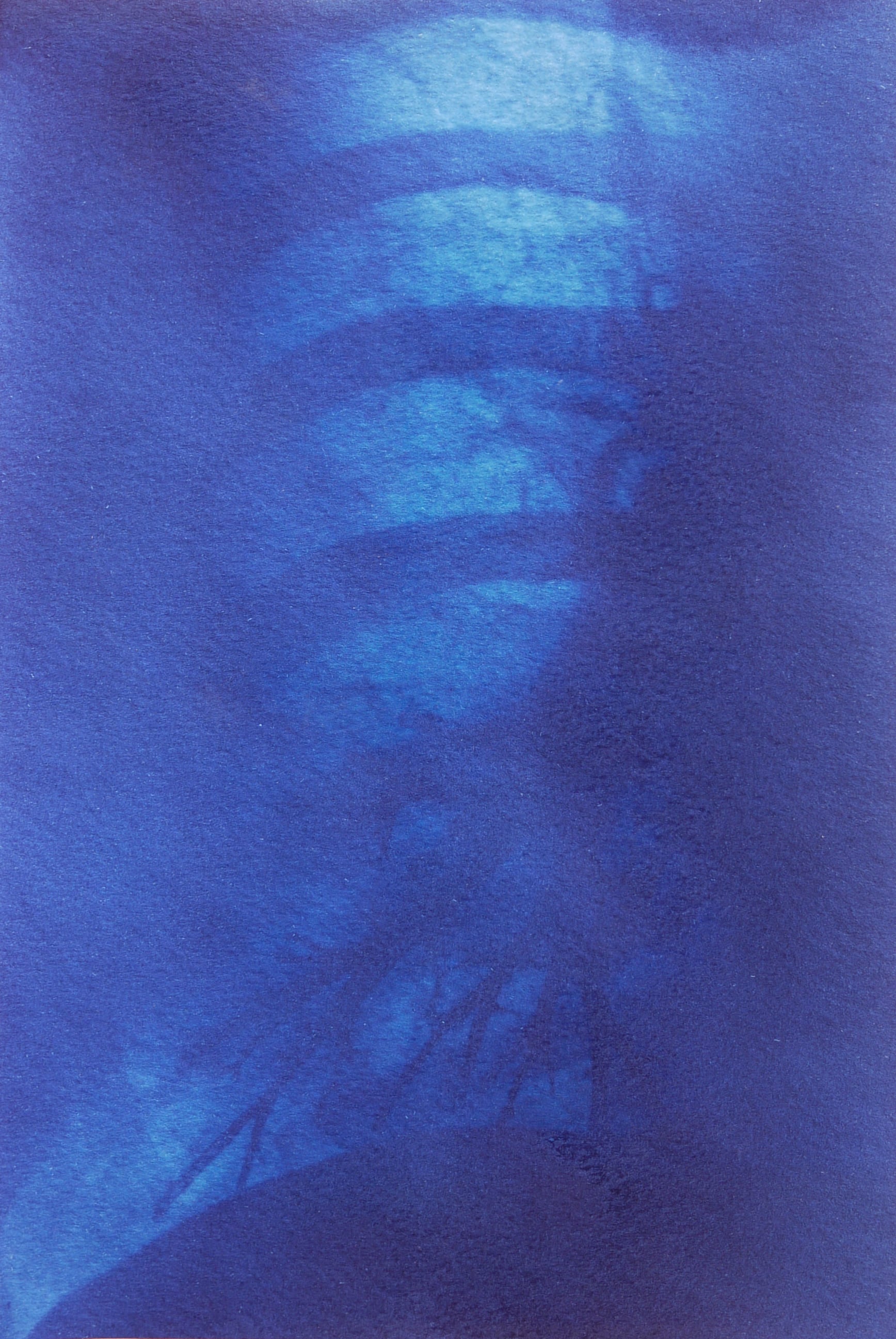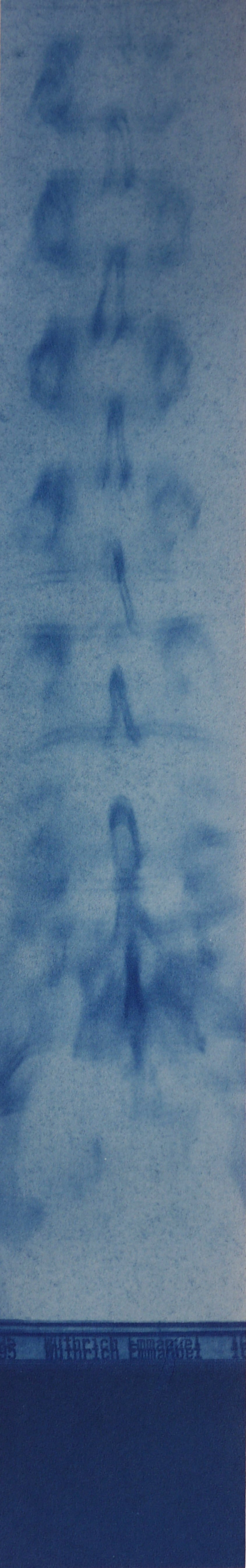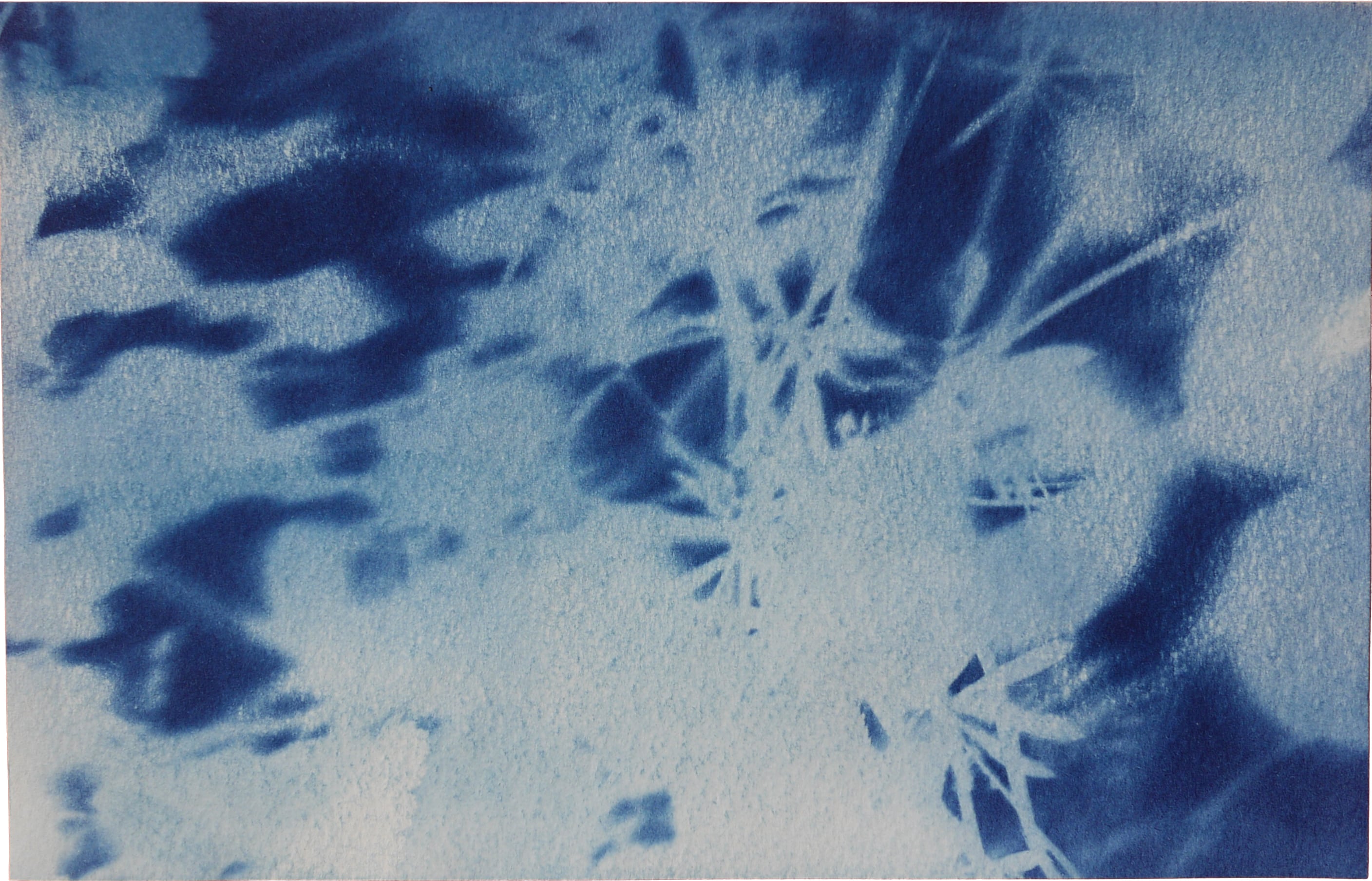 Le cyanotype est une technique photographique ancienne très simple d’approche. Un apprêt photo- sensible appliqué au pinceau sur du papier permet de travailler l’exposition directe au rayonnement du soleil d’un objet (photogramme) ou film par contact (radiographie, négatif…). Les cyanotypes sont des négatifs. Les zones exposées, rincées et fixées à l’eau courante deviennent bleues (de Prusse). Le flou du point de vue présente une parcelle du ciel vu de la fenêtre de mon atelier. Des ciels négatifs. Et pourtant bleus. Parfois, les images sont brûlées par le point focal du soleil, quand il pénètre directement dans la boîte. Mémoire (des traces).
