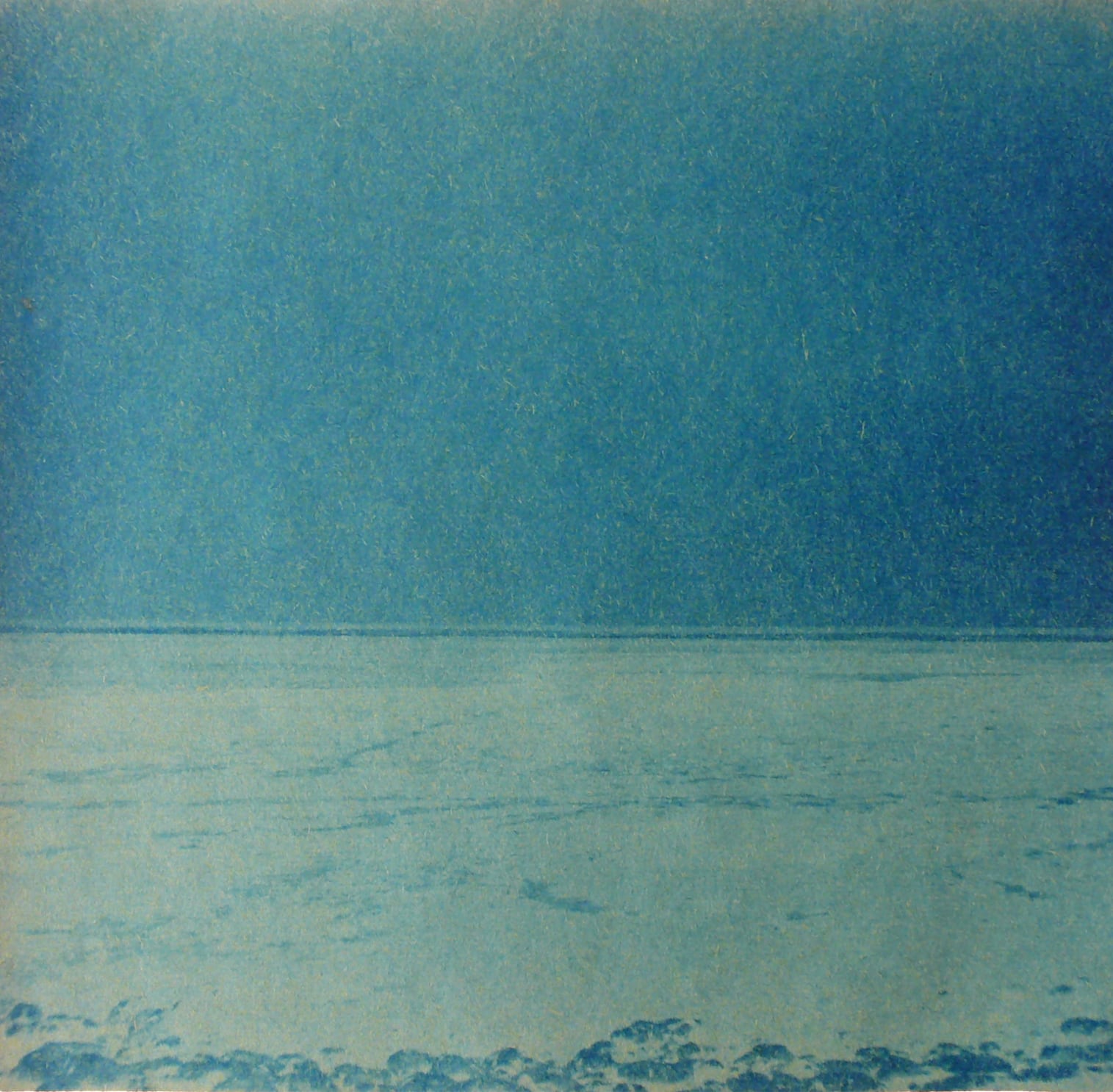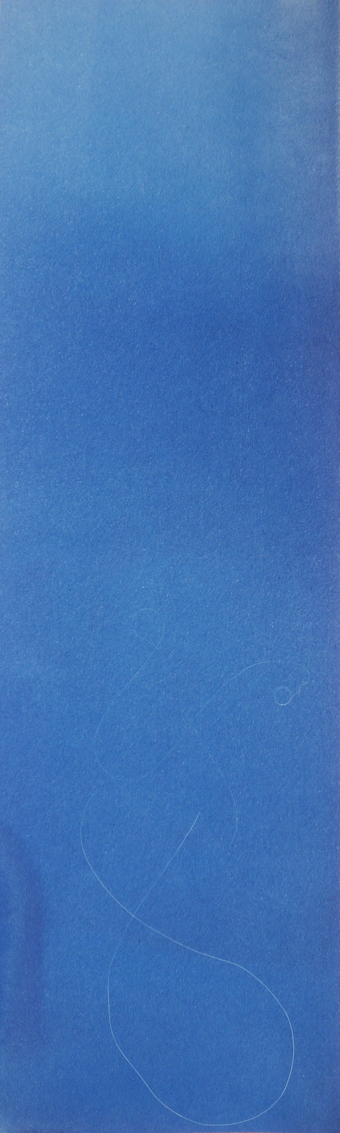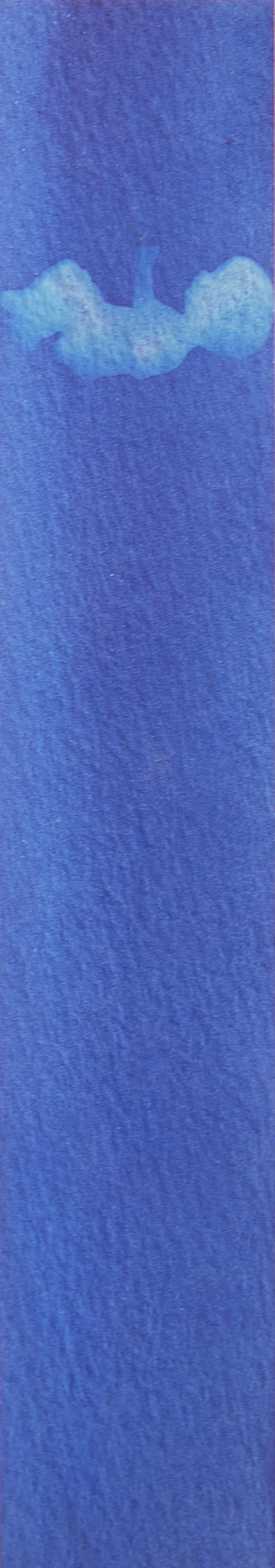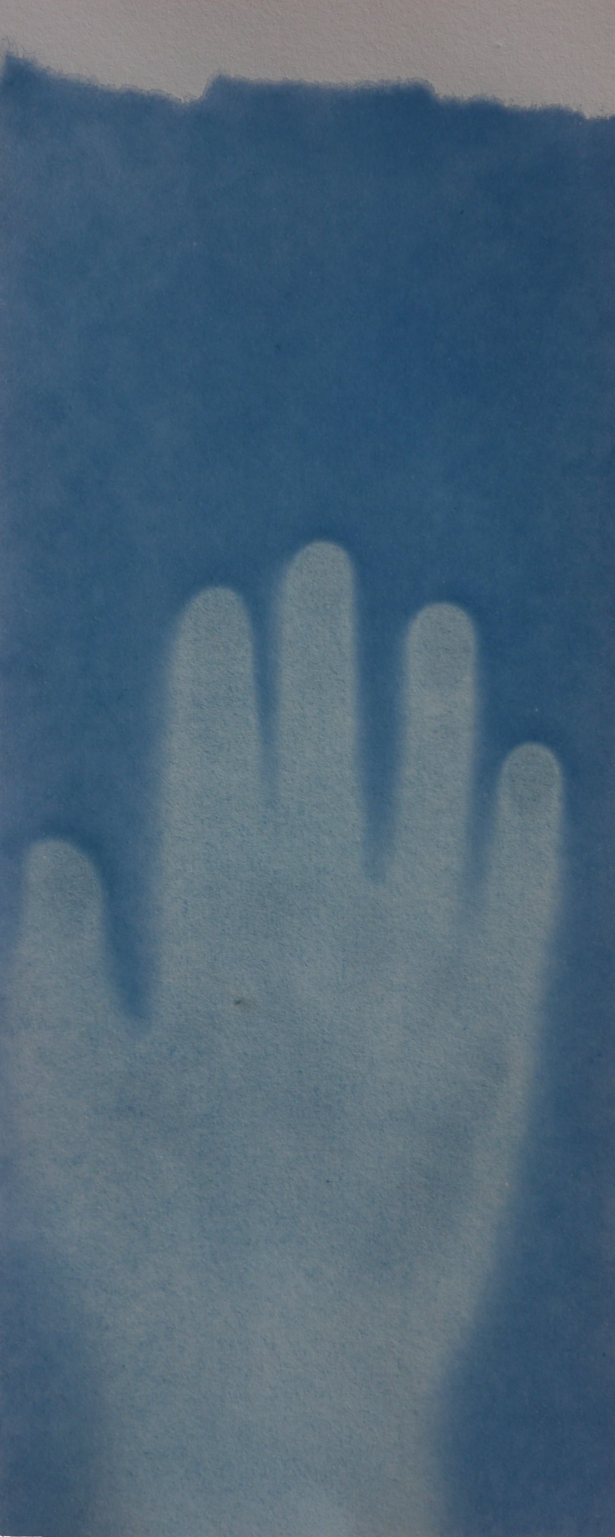 Le cyanotype est une technique photographique ancienne très simple d’approche. Un apprêt photo- sensible appliqué au pinceau sur du papier permet de travailler l’exposition directe au rayonnement du soleil d’un objet (photogramme) ou film par contact (radiographie, négatif…). Les cyanotypes sont des négatifs. Les zones exposées, rincées et fixées à l’eau courante deviennent bleues (de Prusse). Le flou du point de vue présente une parcelle du ciel vu de la fenêtre de mon atelier. Des ciels négatifs. Et pourtant bleus. Parfois, les images sont brûlées par le point focal du soleil, quand il pénètre directement dans la boîte. Mémoire (des traces).