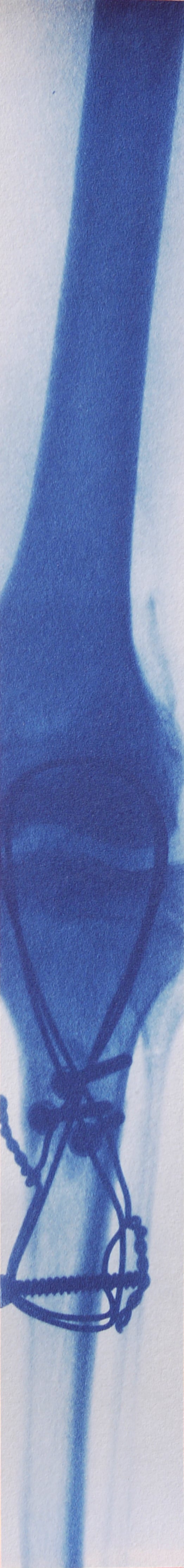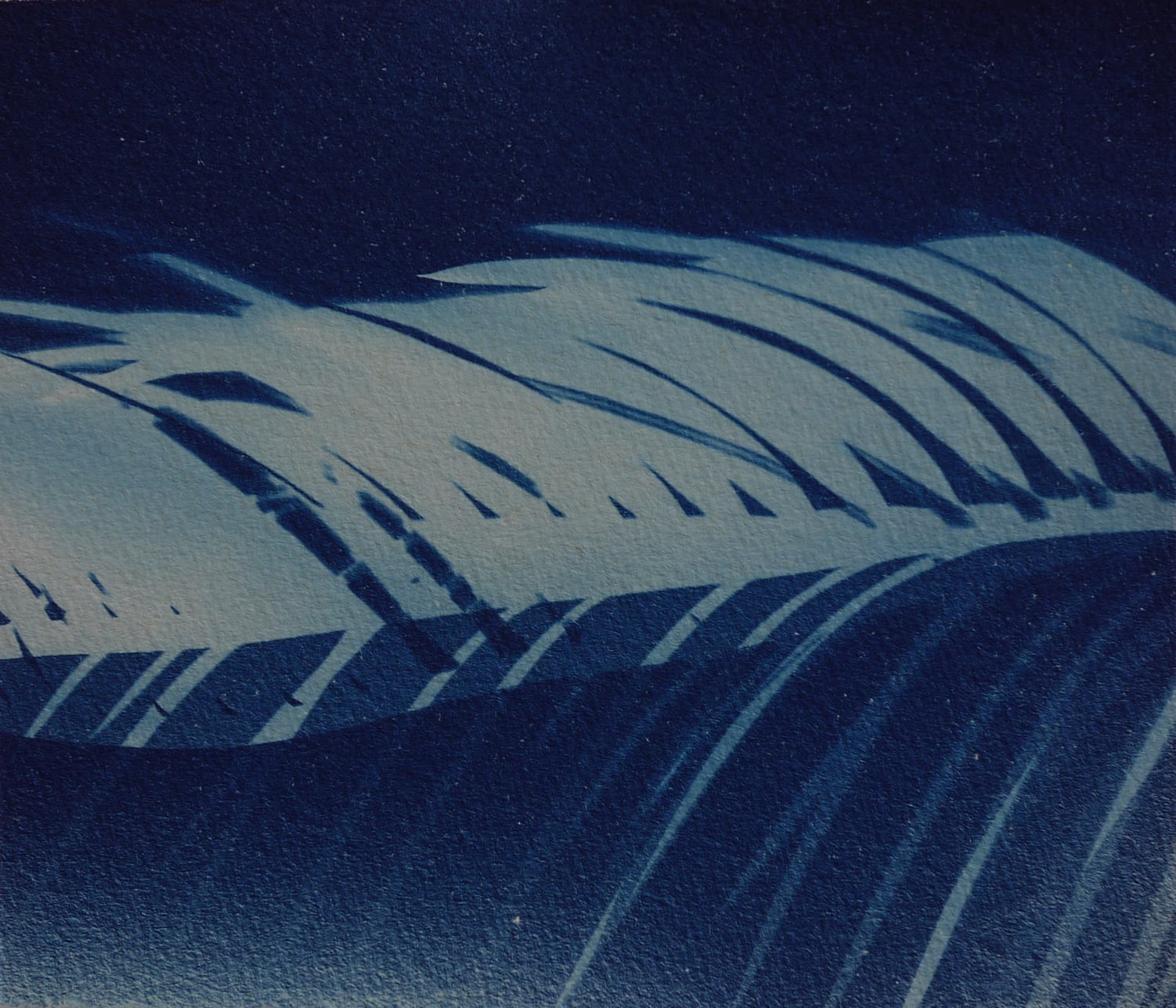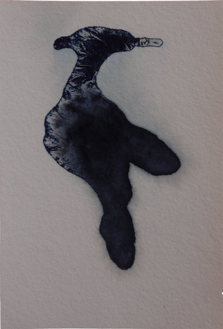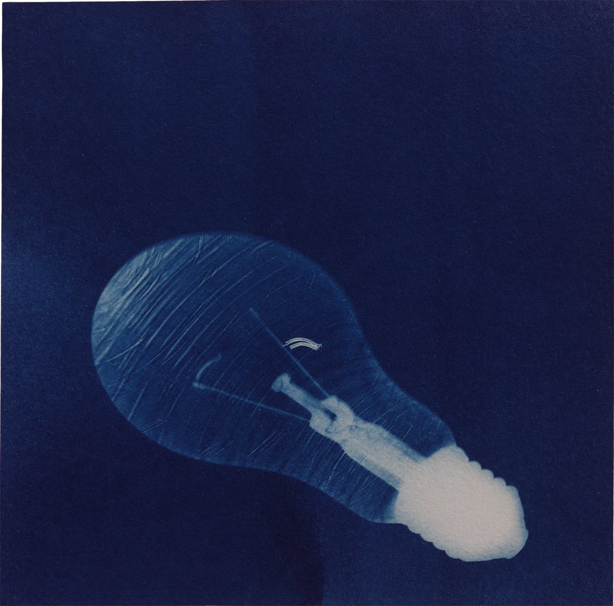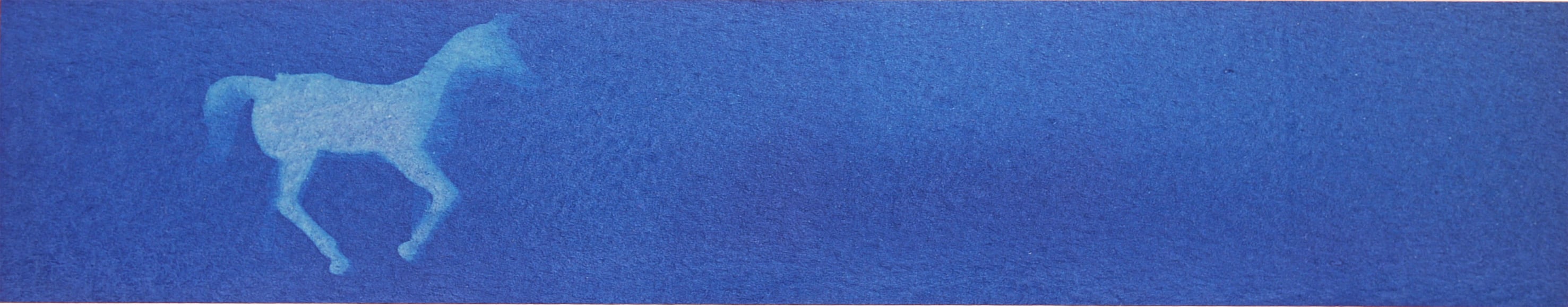Le cyanotype est une technique photographique ancienne très simple d’approche. Un apprêt photo- sensible appliqué au pinceau sur du papier permet de travailler l’exposition directe au rayonnement du soleil d’un objet (photogramme) ou film par contact (radiographie, négatif…). Les cyanotypes sont des négatifs. Les zones exposées, rincées et fixées à l’eau courante deviennent bleues (de Prusse). Le flou du point de vue présente une parcelle du ciel vu de la fenêtre de mon atelier. Des ciels négatifs. Et pourtant bleus. Parfois, les images sont brûlées par le point focal du soleil, quand il pénètre directement dans la boîte. Mémoire (des traces).