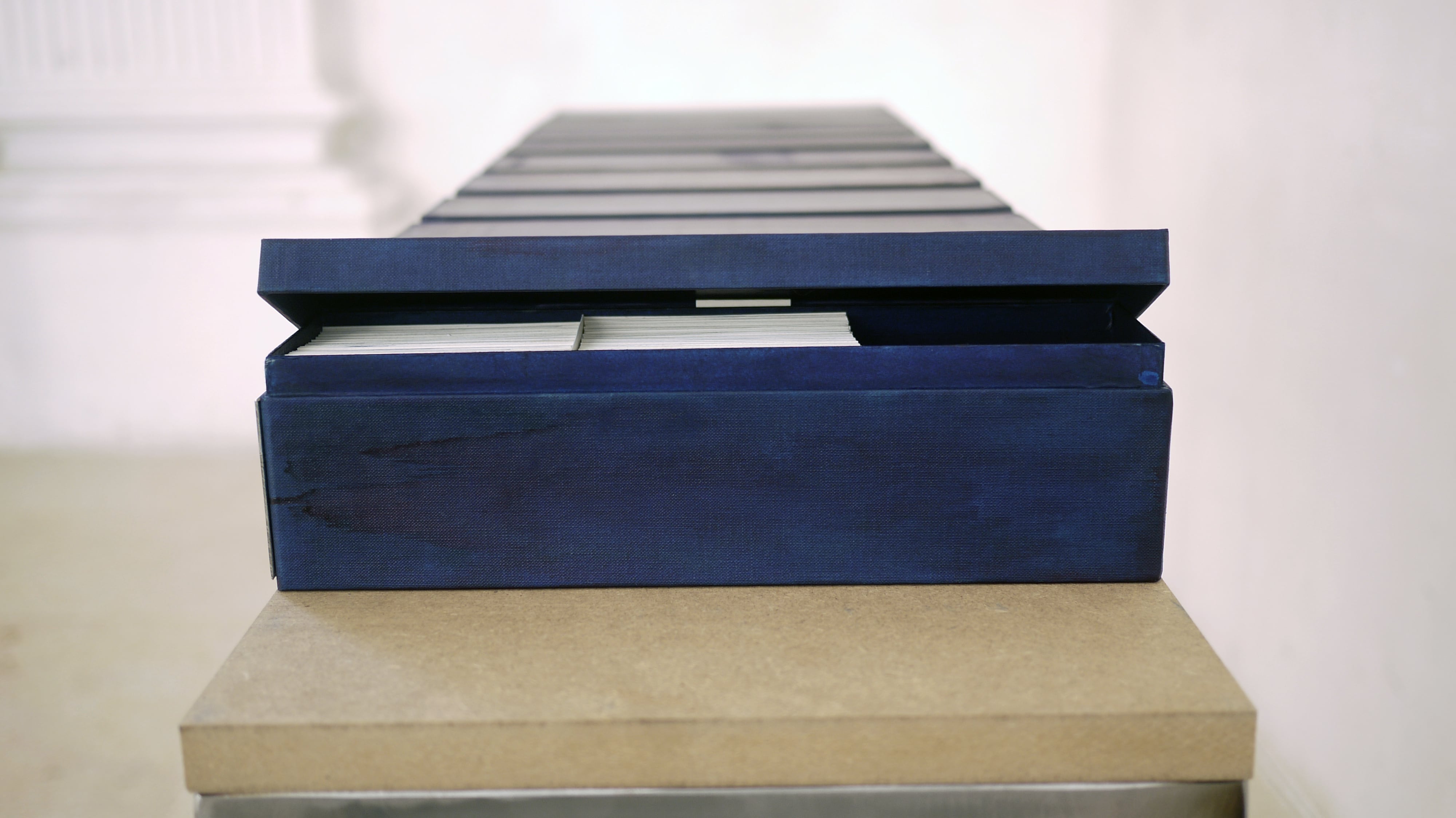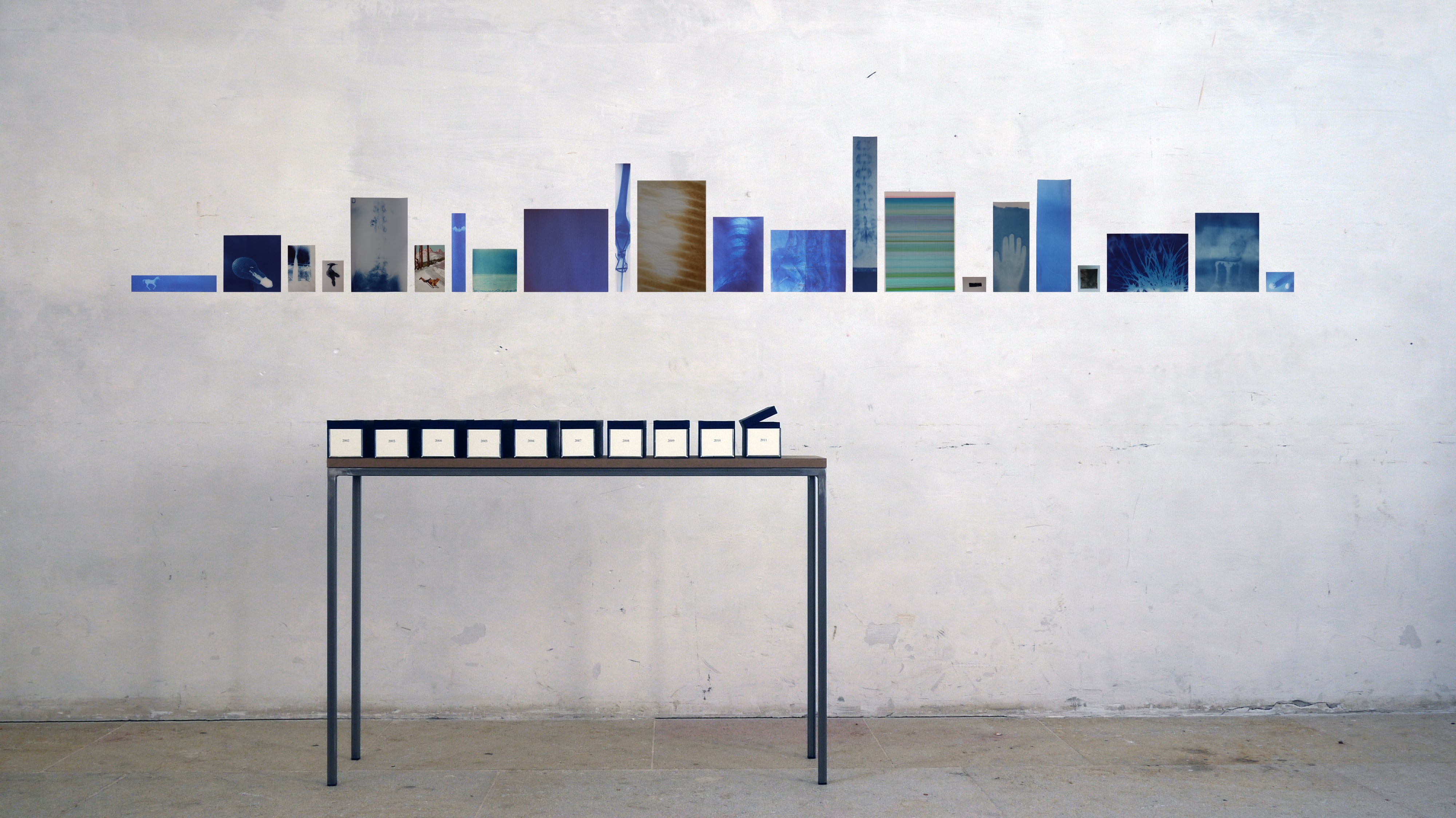 table et boîtes (acier et MDF), 32 x 119 x 88 cm dans les boîtes, 3652 cyanotypes, 10 années du 1er janvier 2002 au 31 décembre 2011 (le projet se poursuit)