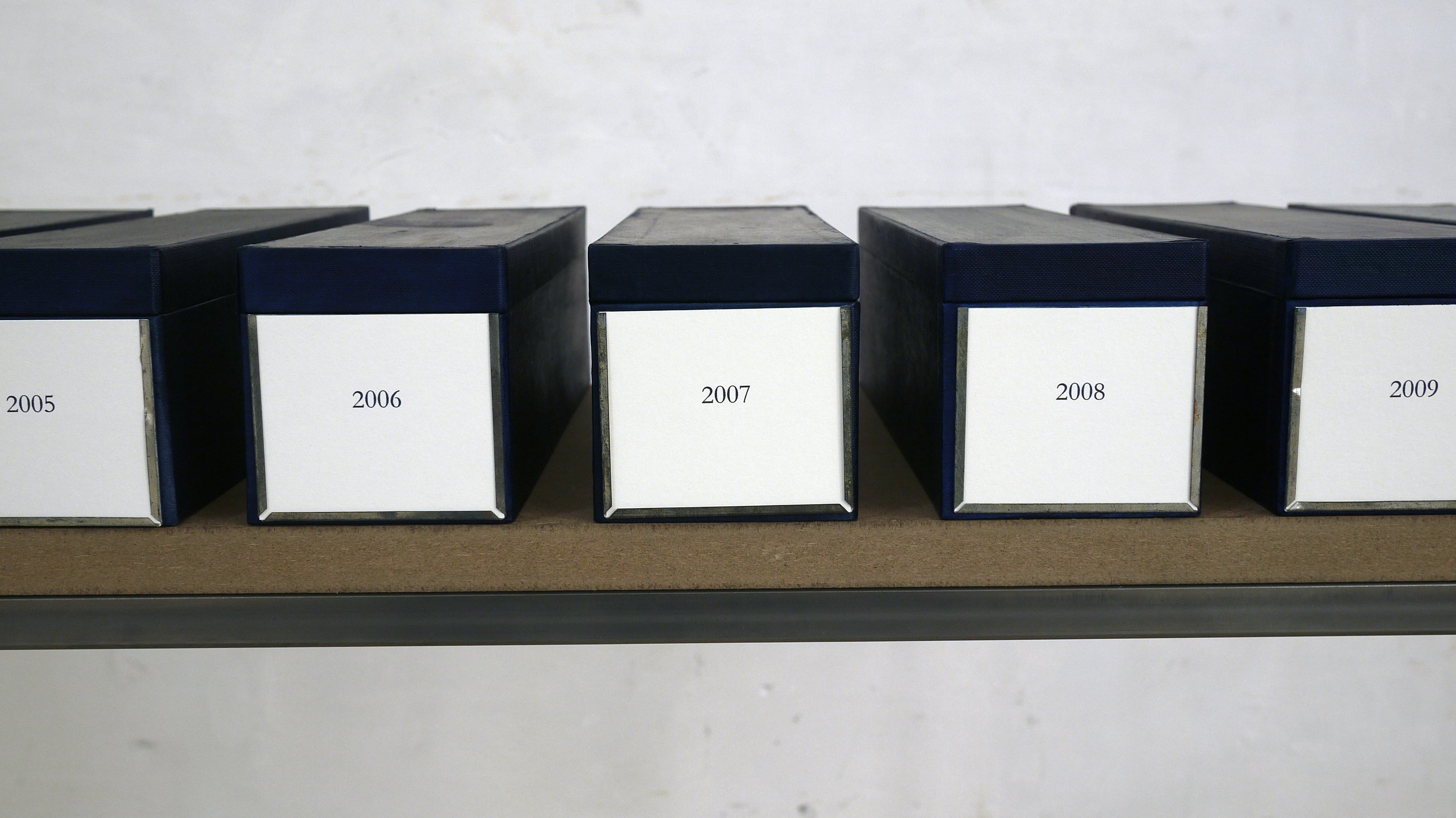 Sur une table, dix boîtes bleues. Neuf sont fermées et contiennent chacune 365 images (ou 366 pour les années bissextiles). Une boîte (2011) est encore ouverte. Chaque image est un cyanotype réalisé en 24 heures, depuis le 1er janvier 2002. Des traces de lumière retenue prisonnière d’une surface photosensible, dans une «boîte-appareil photographique» rudimentaire à grosse lentille. Elles témoignent d’un temps passé, d’un espace visé. Le rôle du photographe, dans ce processus, n’est autre que de décider le temps de la pose et la portion du monde qu’il souhaite rendre visible… ou re-présenter (dans un nouveau présent). Ce temps et cet espace, ici, sont continus, contenus. Un jour devient une image, une année se retrouve dans une boîte.