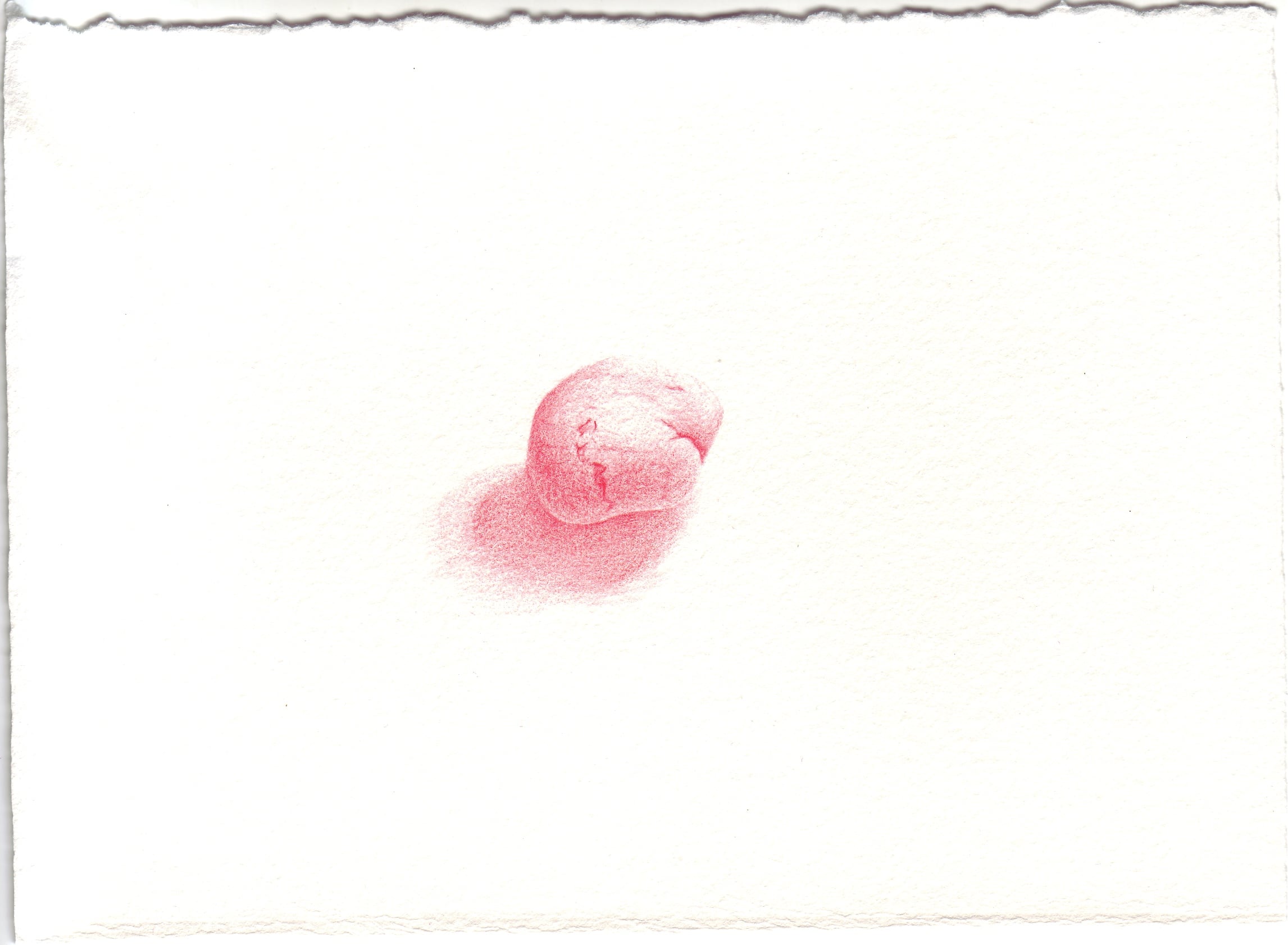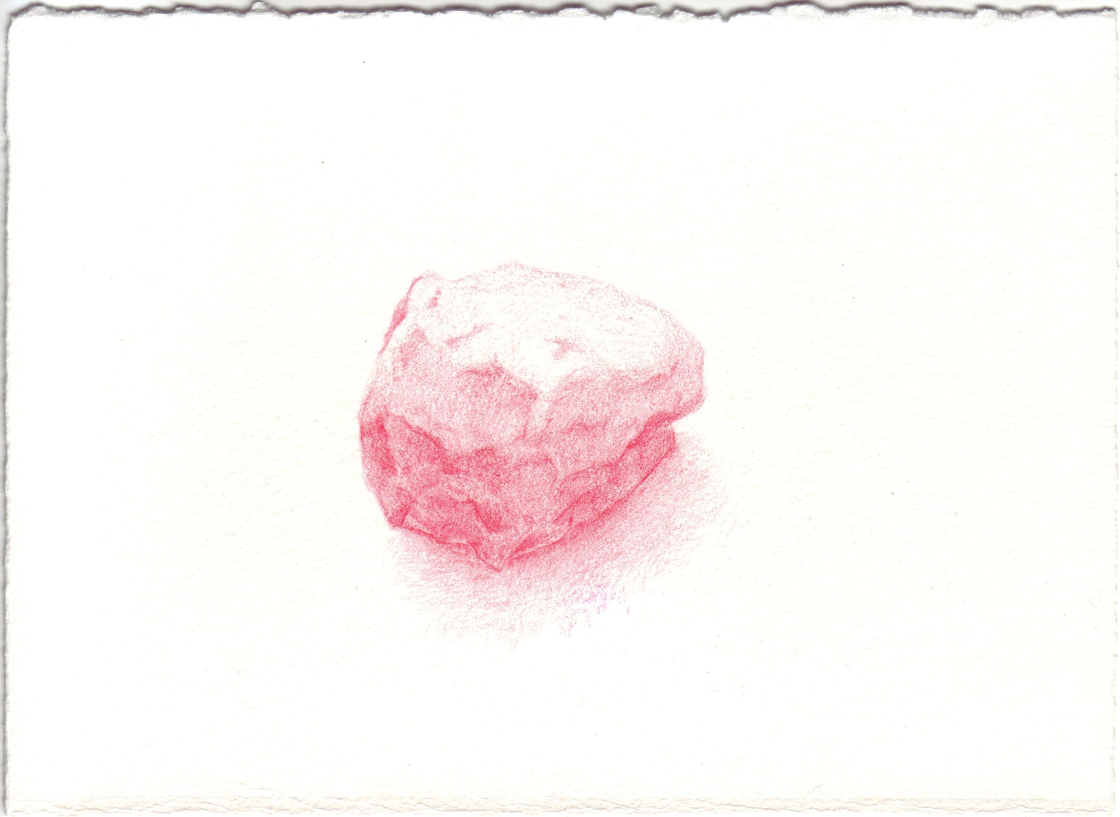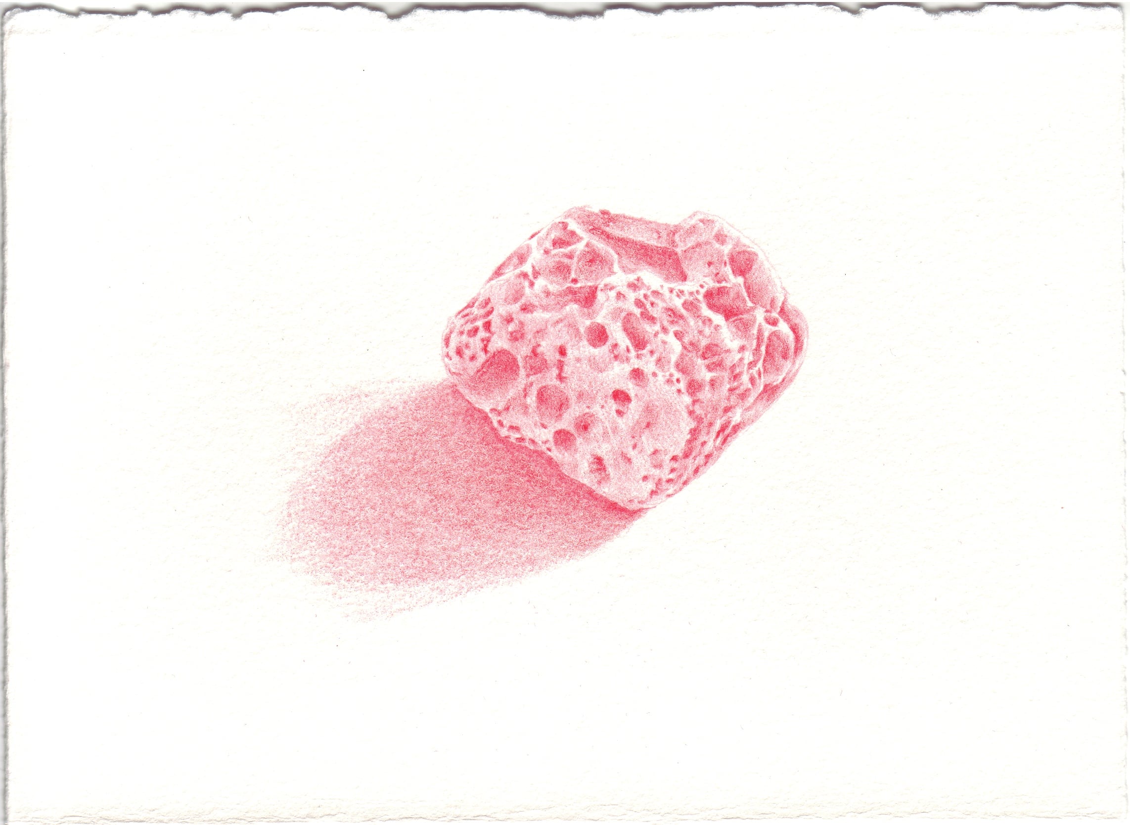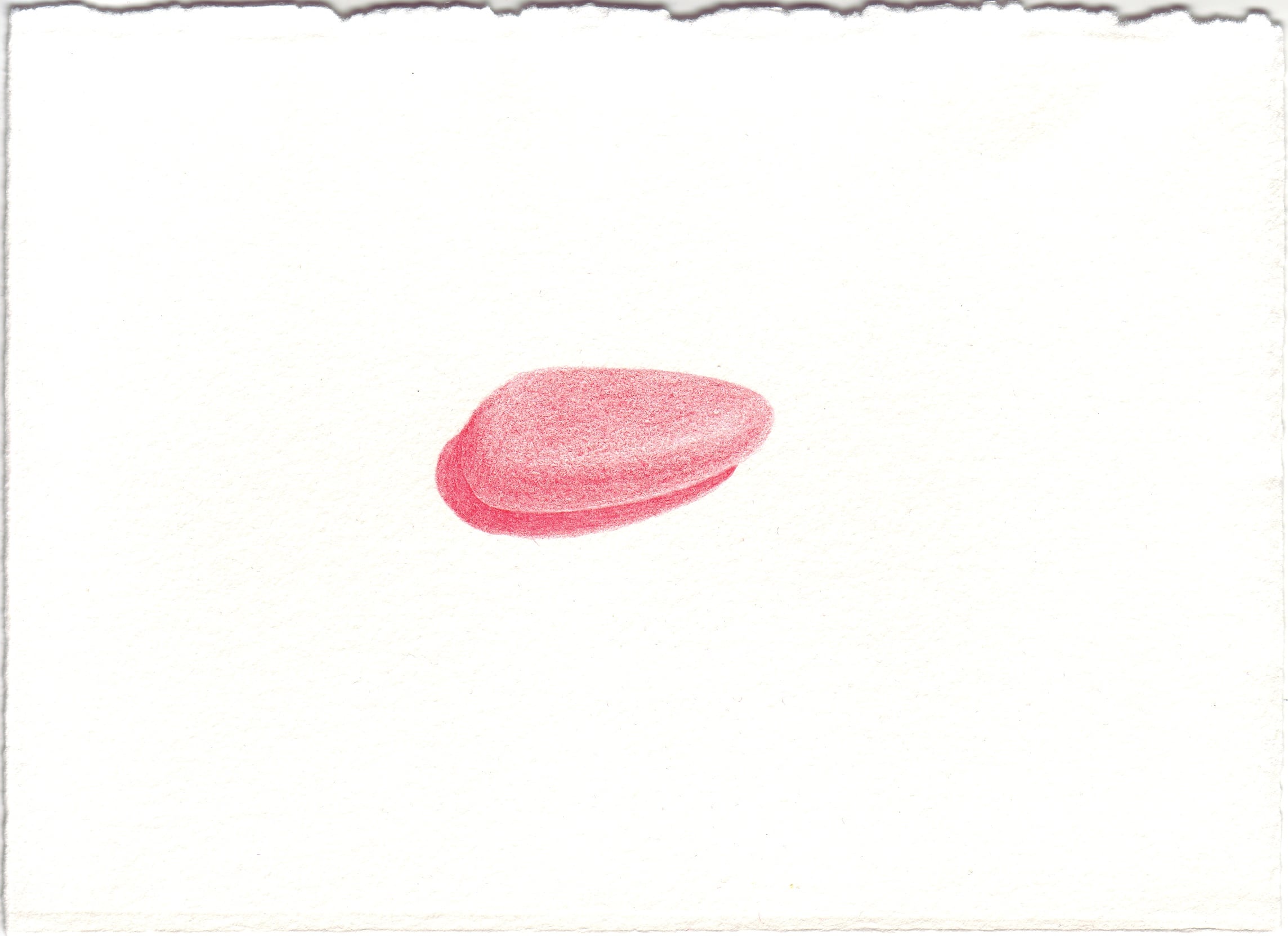 30 dessins (cailloux I à XXX) au crayon de couleur rouge sur papier Zerkall (19.3 x 14 cm chacun – ensemble : 125 x 75 cm), 2012