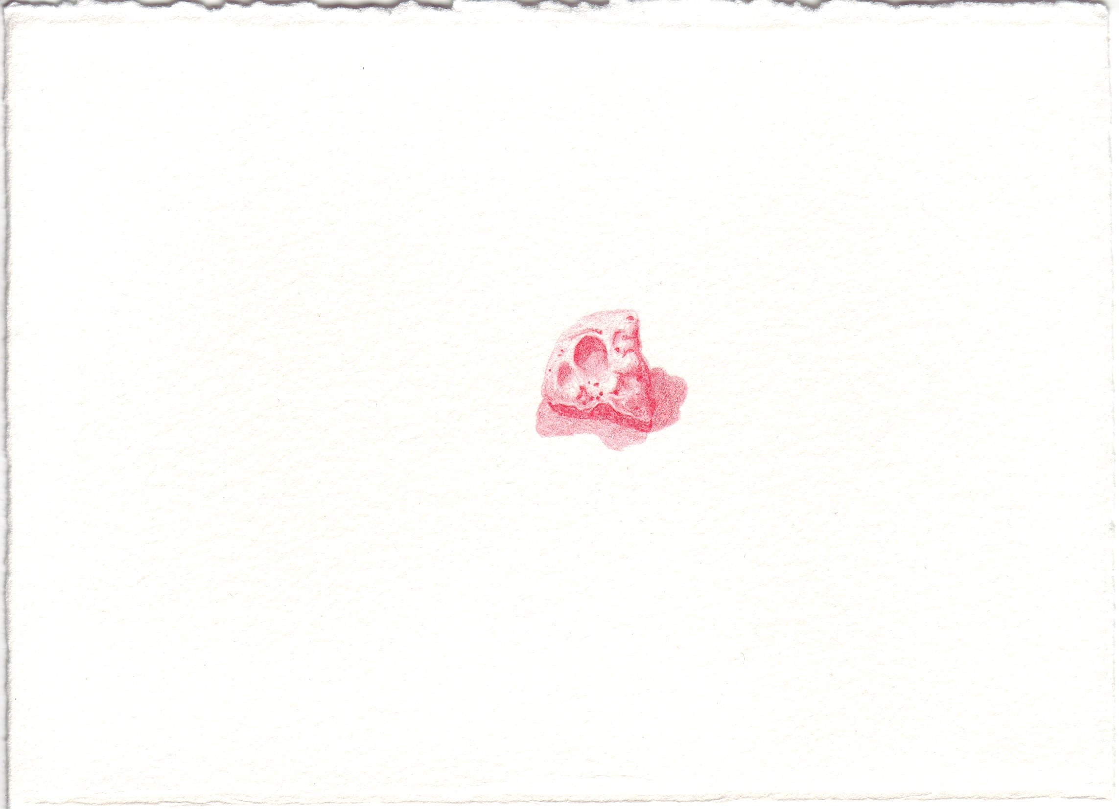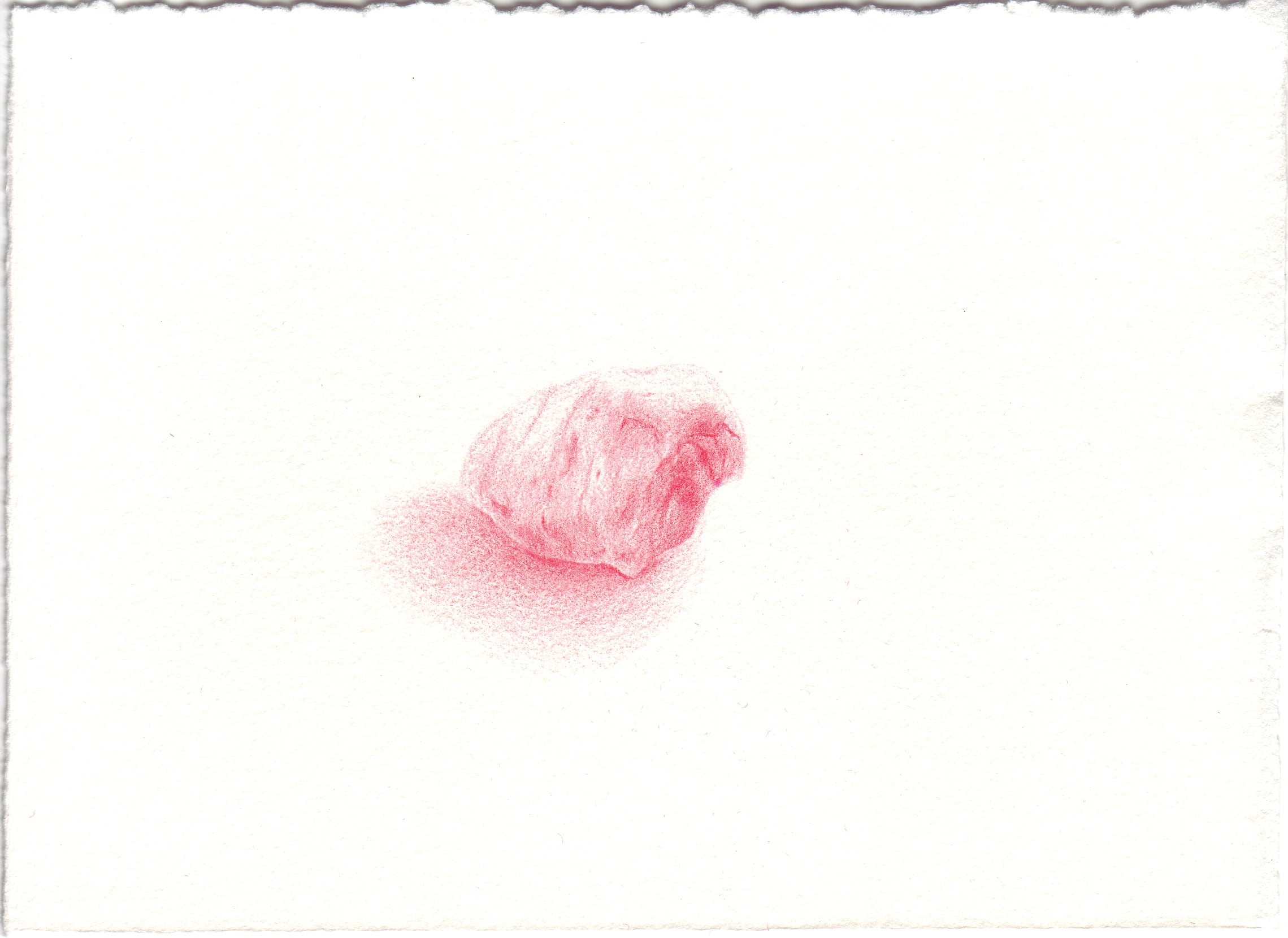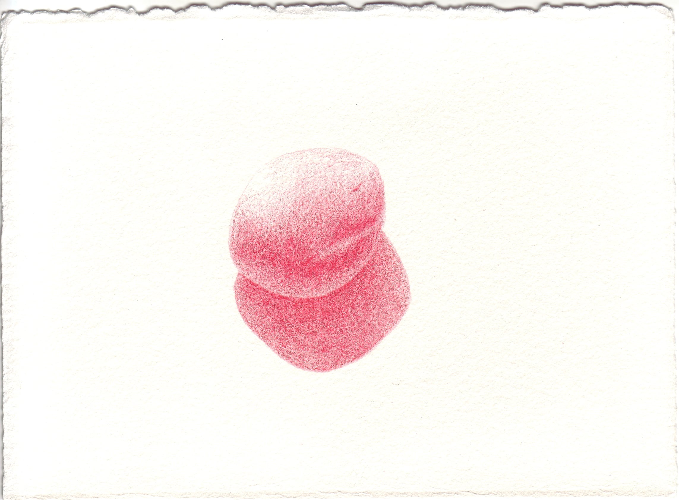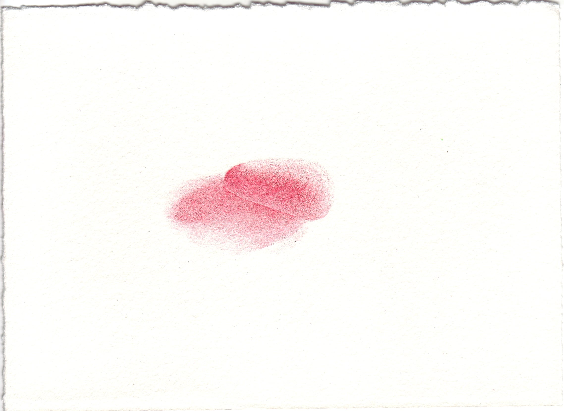 30 dessins (cailloux I à XXX) au crayon de couleur rouge sur papier Zerkall (19.3 x 14 cm chacun – ensemble : 125 x 75 cm), 2012
