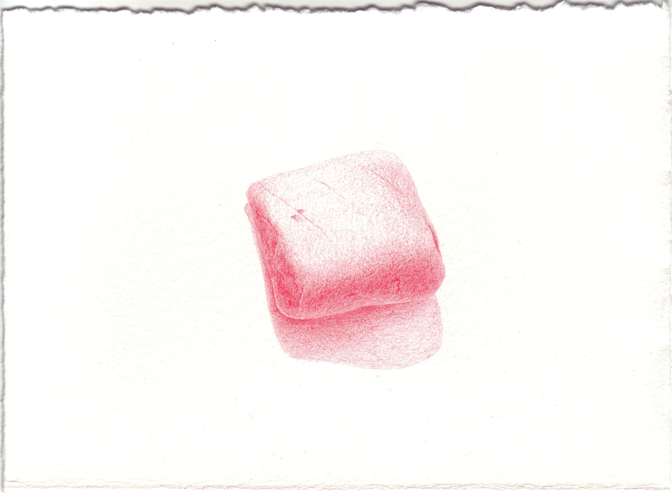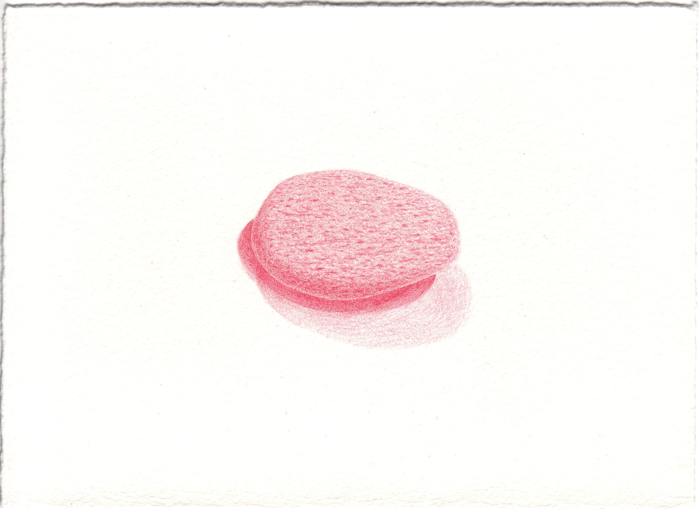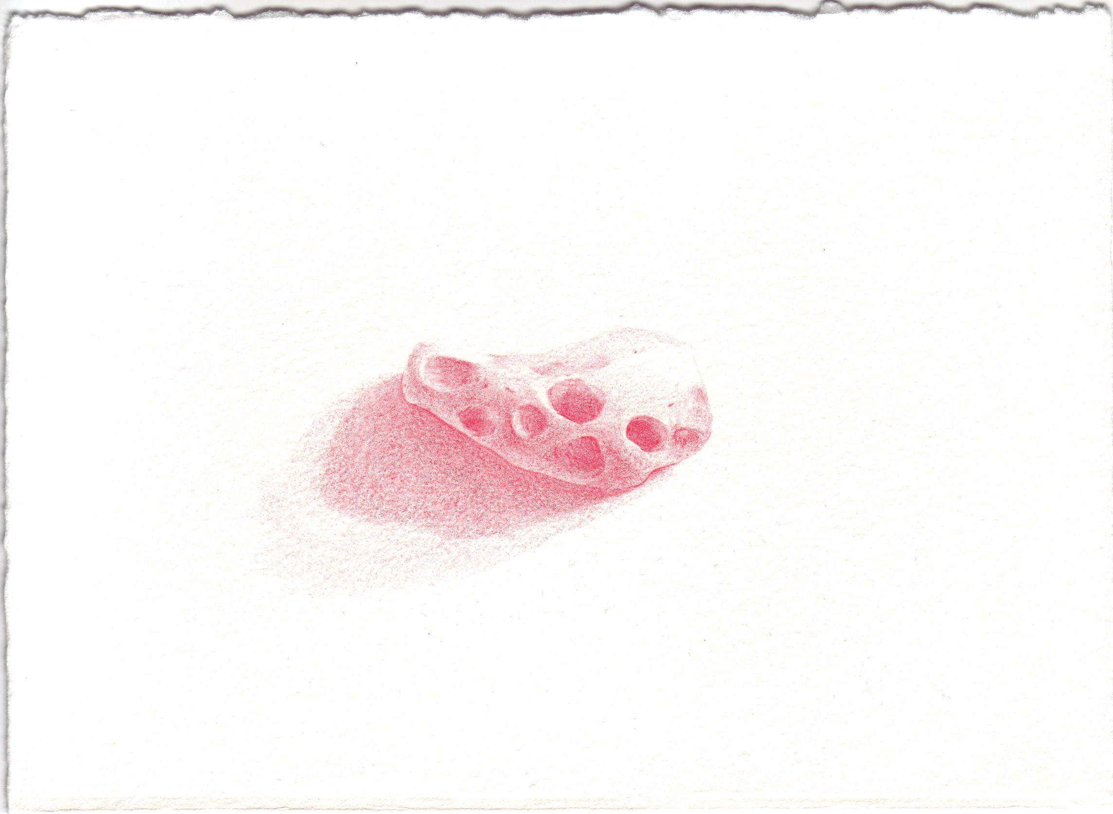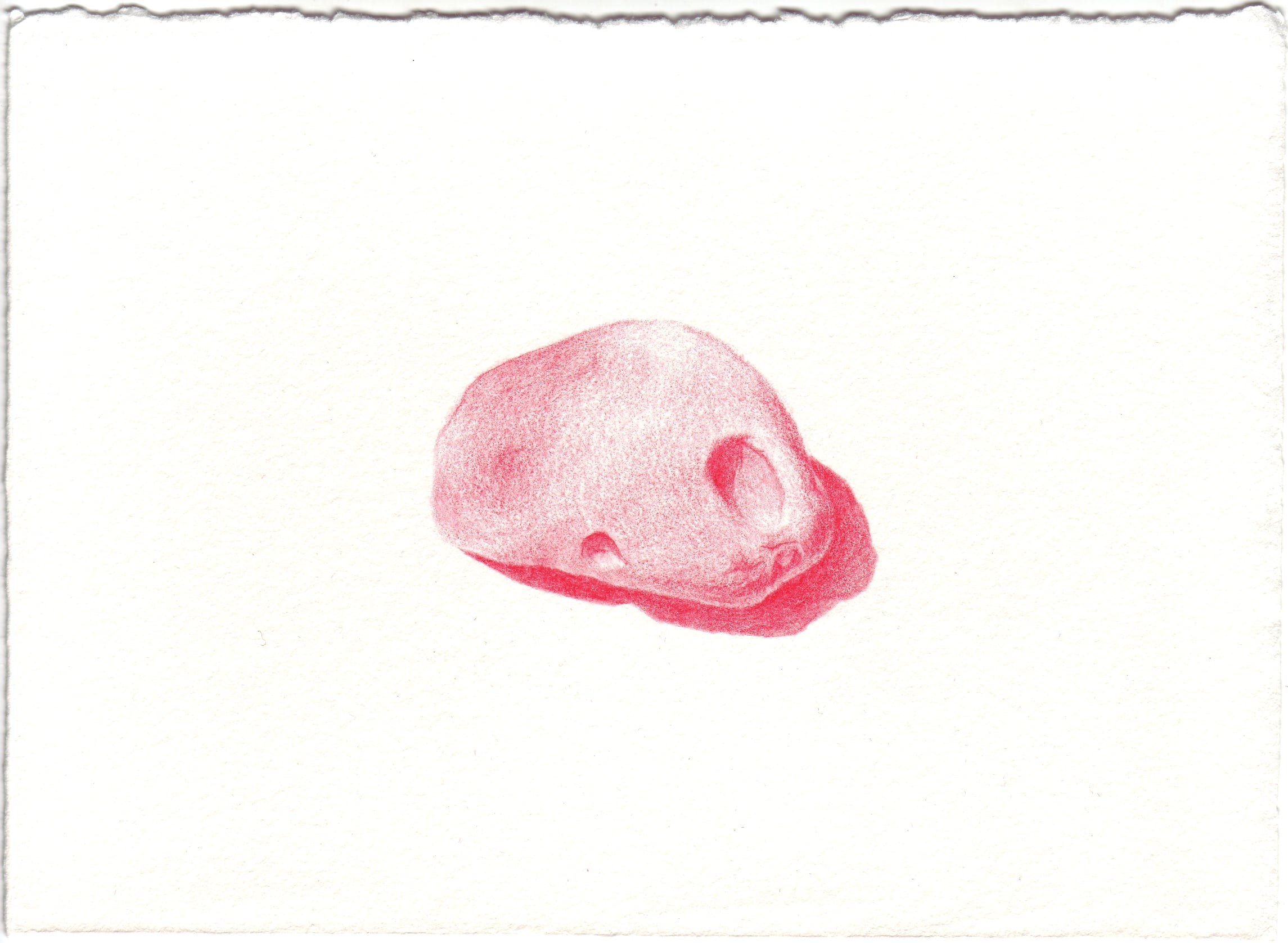 30 dessins (cailloux I à XXX) au crayon de couleur rouge sur papier Zerkall (19.3 x 14 cm chacun – ensemble : 125 x 75 cm), 2012