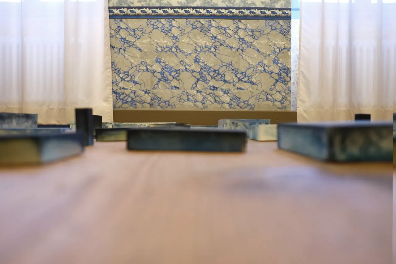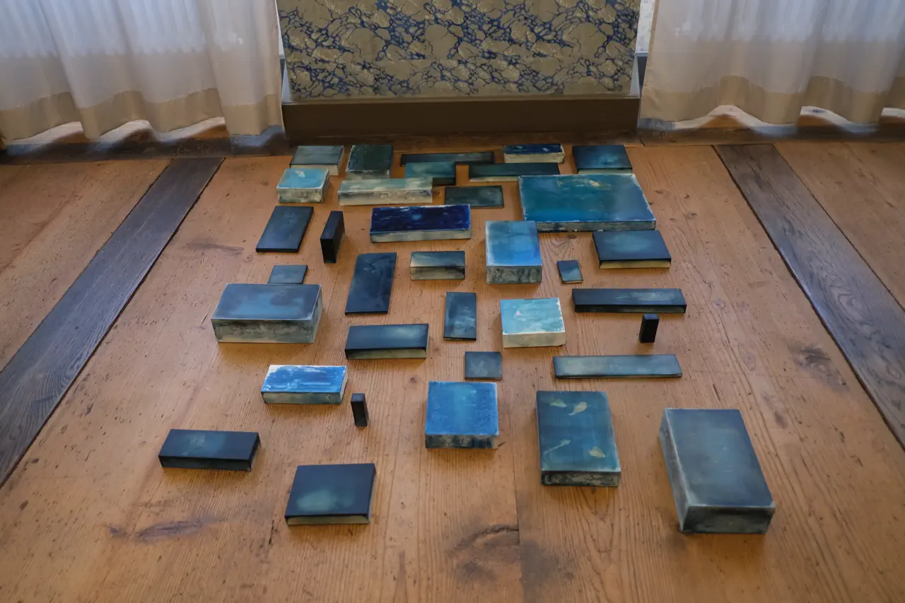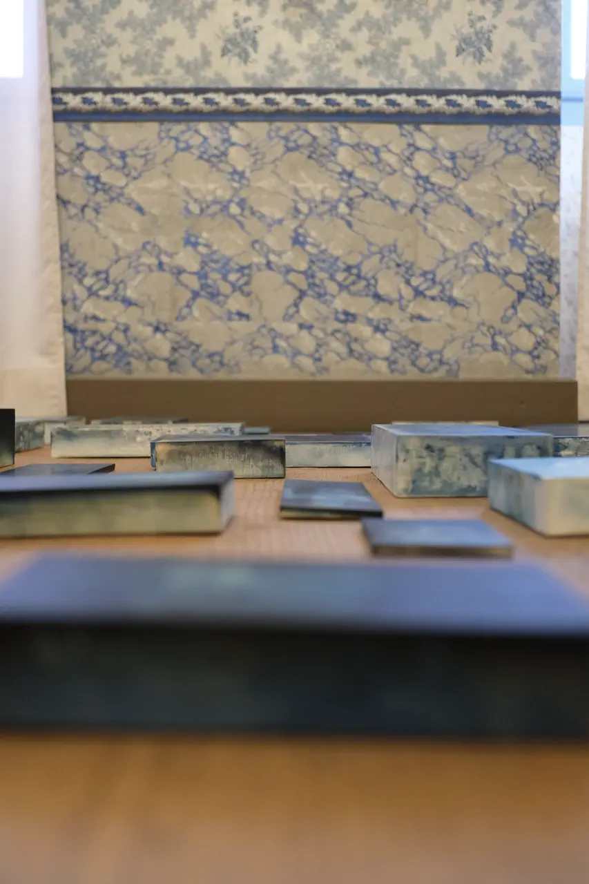 Cette installation est présentée dans la chambre bleue du Musée du papier peint à Mézières, Fribourg.