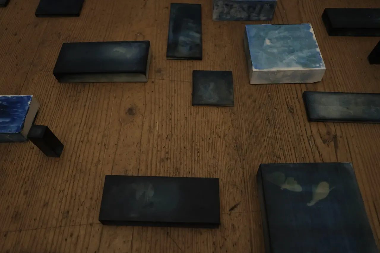 Les quelques traces et ombres légères recueillies sur les cyanotypes en sont de modestes alertes. De fragiles blocs de plâtre imprégnés d’une émulsion photographique et patinés à la cire d’abeille (!) disent une préoccupation.